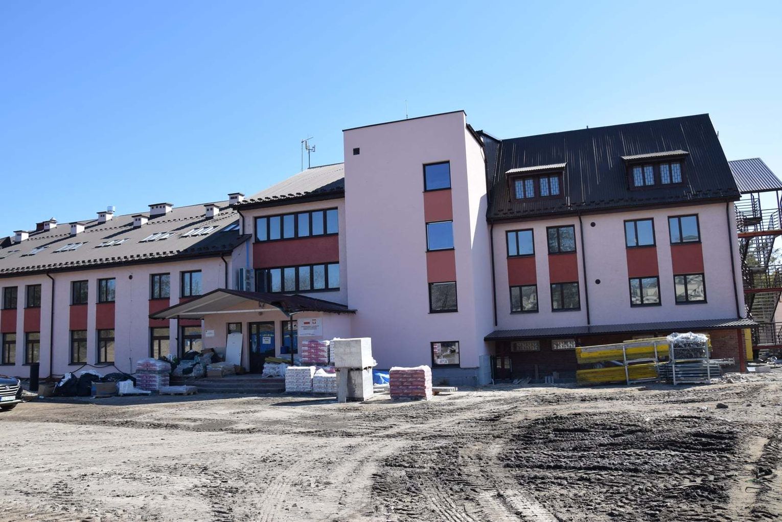 Wykonywane są też prace na zewnątrz budynku. Układana jest kostka na placu. W budowie jest też garaż, który będzie również służył za magazyn i punkt dostaw. Wkrótce pojawią się nowe nasadzenia drzew i krzewów.
