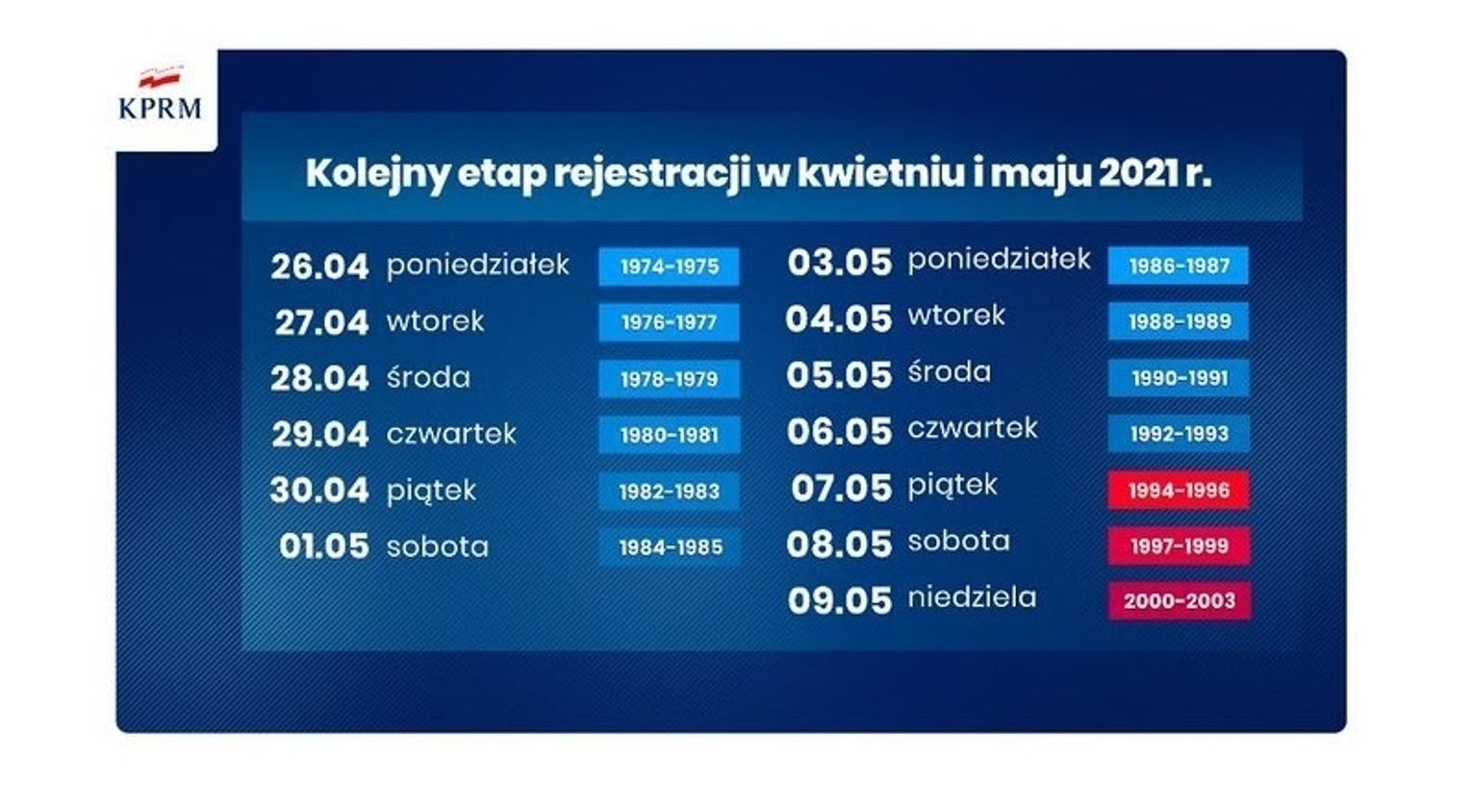 - 28 kwietnia zostanie uruchomiona rejestracja dla osób pomiędzy 30. a 39. rokiem życia, które zgłosiły wcześniej chęć zaszczepienia się. To około 400 tysięcy osób - powiedział szef KPRM. 4 maja otwarta zostanie rejestracja dla osób z grupy wiekowej 18-29 lat, które wypełniły formularz chęci zaszczepienia. To około 340 tysięcy osób.