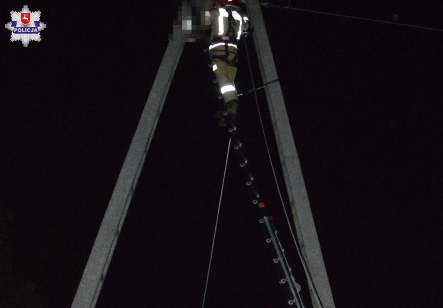 W poniedziałek około godziny 21.00 dyżurny parczewskiej komendy otrzymał zgłoszenie, że w Parczewie na ul. Żabiej młody mężczyzna został porażony prądem i potrzebuje pomocy. Na miejsce zostali skierowani policjanci. Na miejscu zastali mężczyznę, który wisiał na słupie linii wysokiego napięcia głową do dołu na wysokości ponad 10 metrów na ziemią.