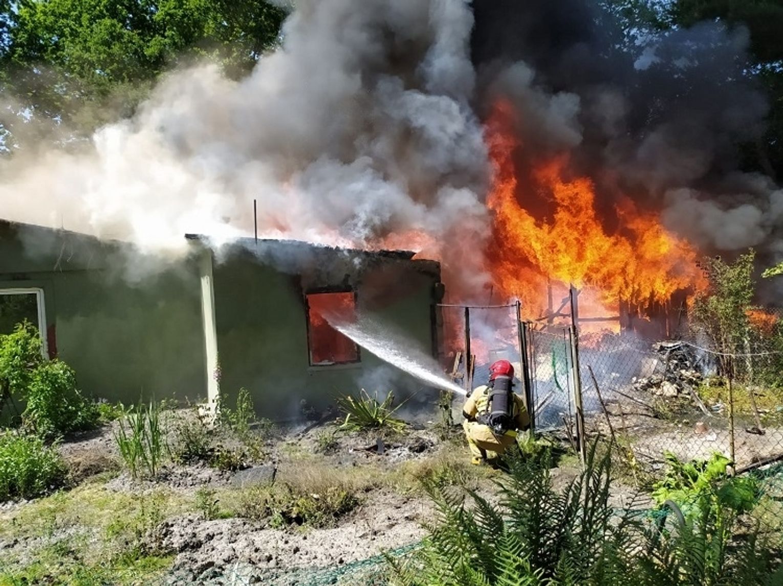 Po przybyciu jednostek straży pożarnej na miejsce zdarzenia stwierdzono, że pożarem w całości objęty jest drewniano-murowany parterowy budynek mieszkalny, drewniane budynki gospodarcze i zagrożony jest las mieszany sąsiadujący z posesją.