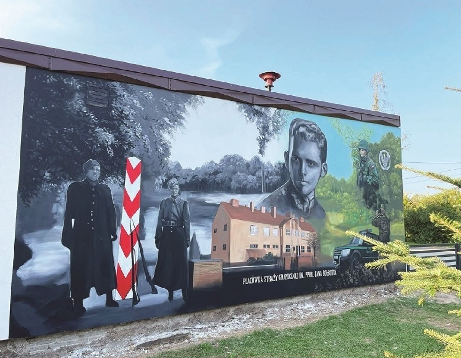 Strażacy, przy pomocy pracowników Gminnego Ośrodka Kultury i Sportu w Hannie, złożyli wniosek do ministerstwa. Na realizację zadania otrzymali 12 tys. zł. Mural pod tytułem „Tu nad Bugiem jest strażnica… – historia i nowoczesność” wykonał Maciej Wierzbicki z firmy Bush Art z Warszawy. Malowidło przedstawia Placówkę Straży Granicznej im. podporucznika Jana Bołbotta.
