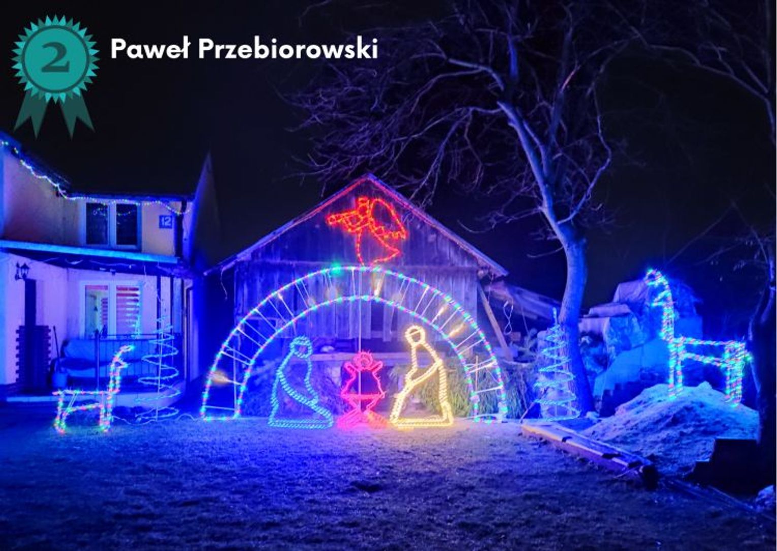 Drugie miejsce i nagrodę pieniężną w wysokości 300 zł zdobył Paweł Przebiorowski. Jego kompozycja już w ubiegłym roku została doceniona przez jury. W tej edycji zdecydowanie jest rozbudowana i tworzy świetlistą bożonarodzeniową szopkę.