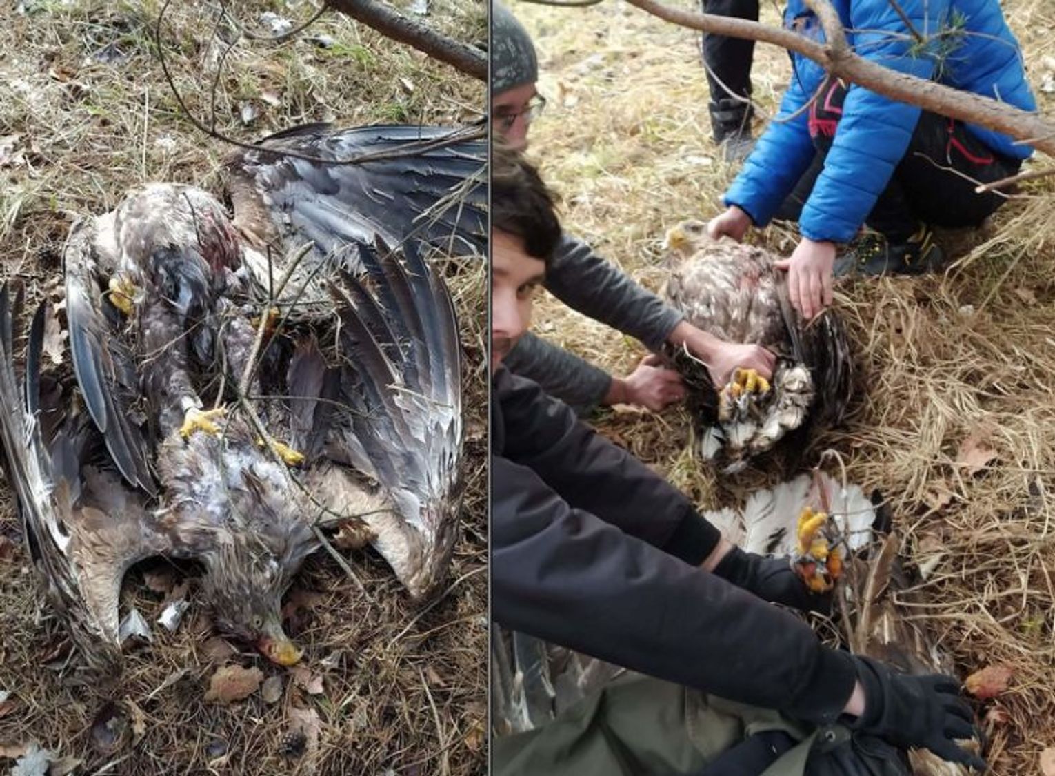 Była niedziela, 6 lutego, gdy mieszkańcy Majdanu Zahorodyńskiego w gminie Siedliszcze dokonali tego nietypowego odkrycia. Dwa duże, ranne ptaki leżały na ziemi, pod sosną, w pobliżu zabudowań. Nie mogły się ruszać, bo były ze sobą szczepione pazurami. Zagrażały im nie tylko inne dzikie zwierzęta, ale też psy z okolicy. Na szczęście ludzie, którzy te ptaki znaleźli, zachowali się, jak należy i wezwali pomoc.