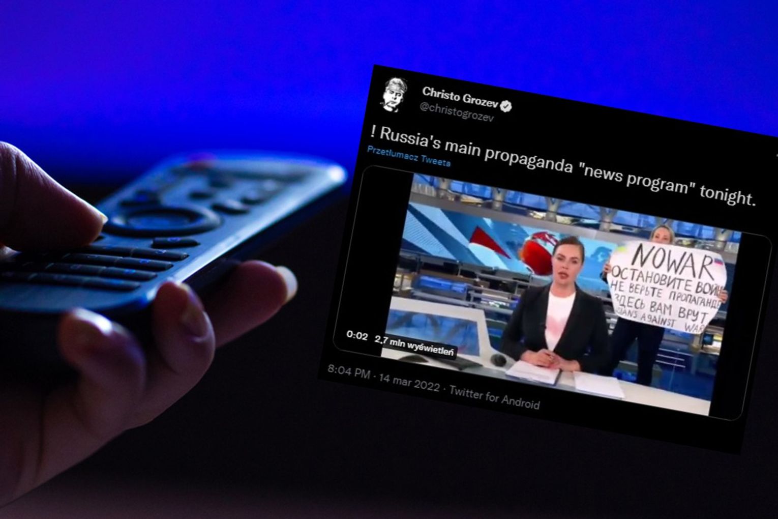 W jednym z poniedziałkowych programów na żywo, emitowanym na antenie rosyjskiej telewizji państwowej, doszło do zaskakującego incydentu. Żeby przeciwstawić się propagandzie rozpowszechnianej przez rząd Władimira Putina, dziennikarka Marina Ovsyannikova przygotowała transparent, z którym wkroczyła na wizję za plecami swojej koleżanki opowiadającej wówczas o sankcjach nakładanych na Federację Rosyjską. Ovsyannikova skandowała hasła: „Zatrzymaj wojnę. Nie dla wojny”. Całe zdarzenie trwało zaledwie kilka sekund, ale odważny czyn kobiety został zauważony m.in. przez bułgarskiego dziennikarza Christo Grozeva, a nagranie szybko obiegło świat.