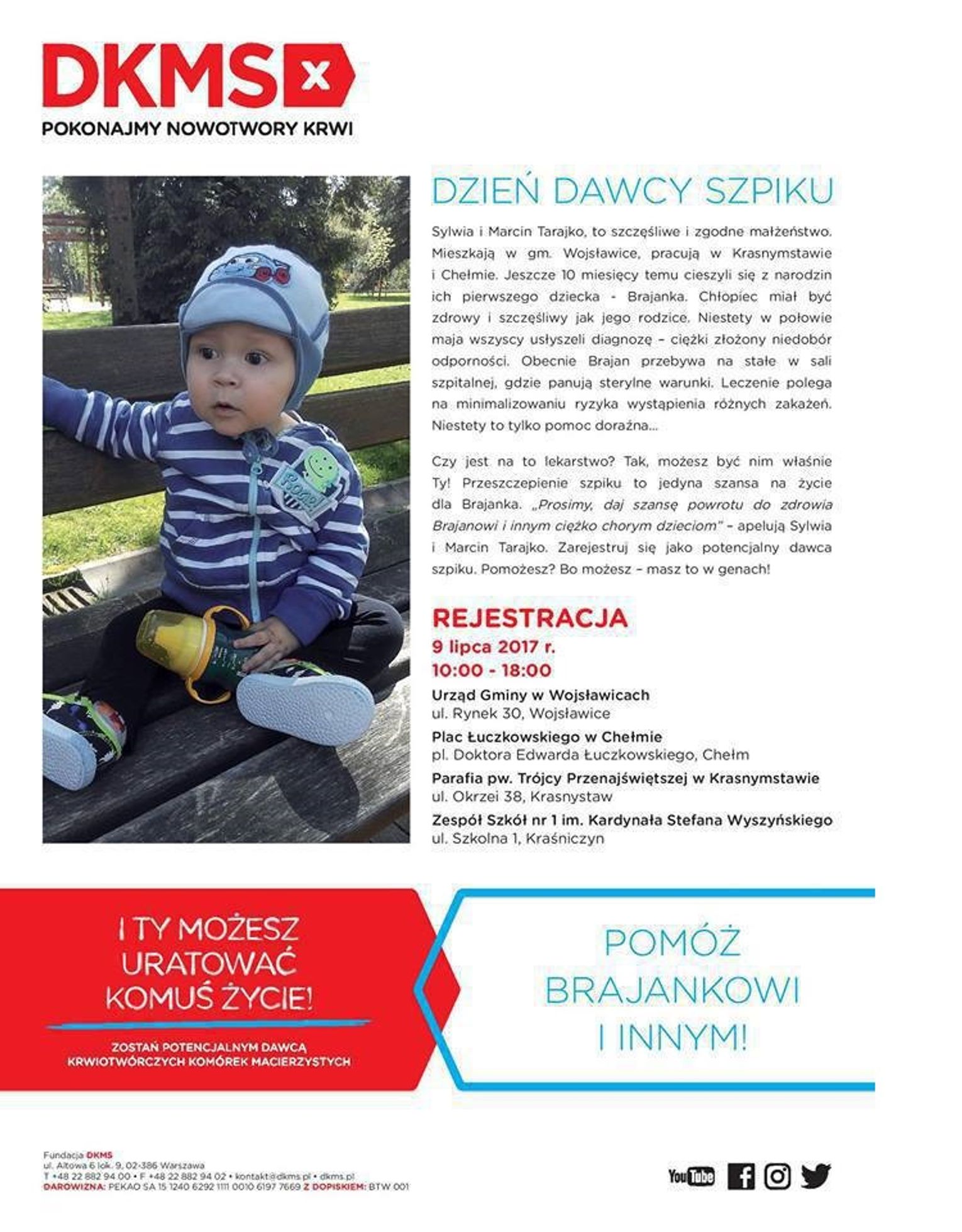 Rejestracja odbywać się będzie 9 lipca w godzinach 10-18,w kilku miejscach jednocześnie (Urząd Gminy w Wojsławicach, ul. Rynek 30; pl. Łuczkowskiego w Chełmie; Parafia pw. Trójcy Przenajświętszej w Krasnymstawie, ul. Okrzei 38; Zespół Szkół nr 1 w Kraśniczynie, ul. Szkolna 1). Akcję prowadzi fundacja DKMS.