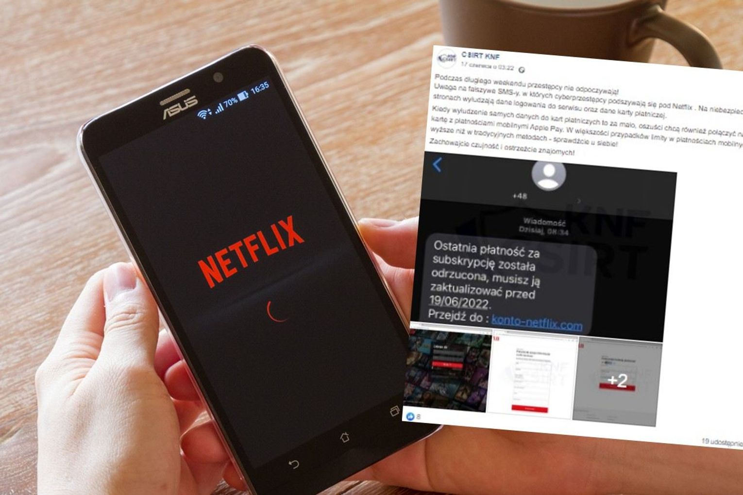 „Uwaga na fałszywe sms-y, w których cyberprzestępcy podszywają się pod Netflix . Na niebezpiecznych stronach wyłudzają dane logowania do serwisu oraz dane karty płatniczej.