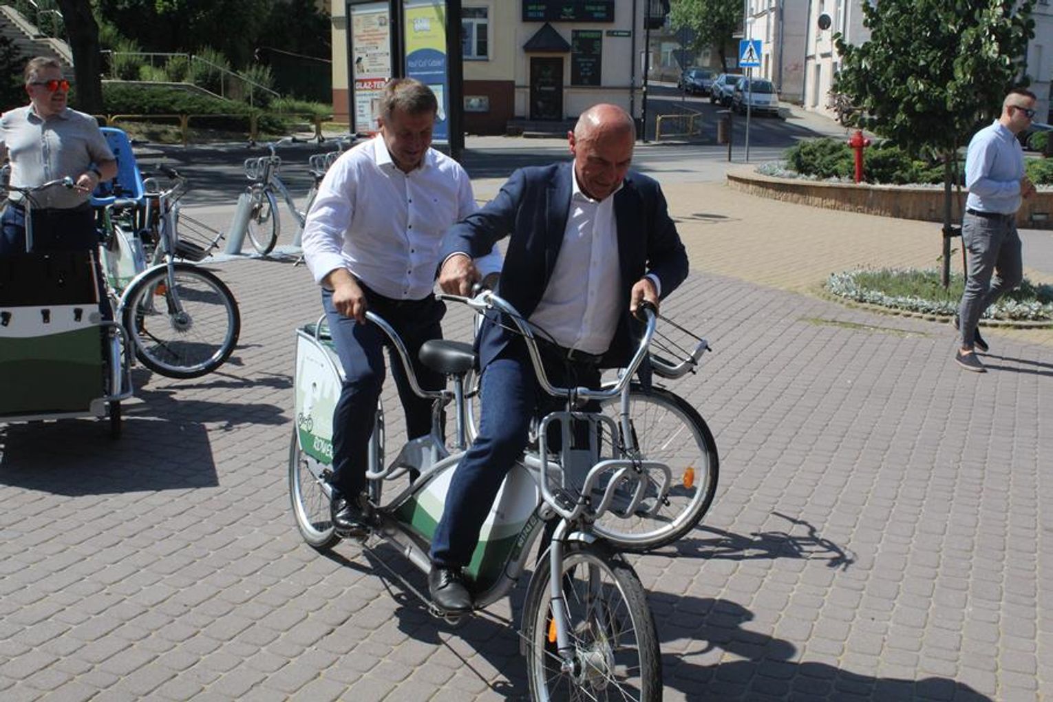 Zarówno wójtowie, jak i przedstawiciel firmy Nextbike nie omieszkali wykonać kilku testowych kółek po placu Gdańskim. Sprawdzili, czy nowe rowery istotnie działają zgodnie z pokładanymi w nich oczekiwaniami. Z wyników tego testu bardzo zadowolony był wójt Wiesław Kociuba.