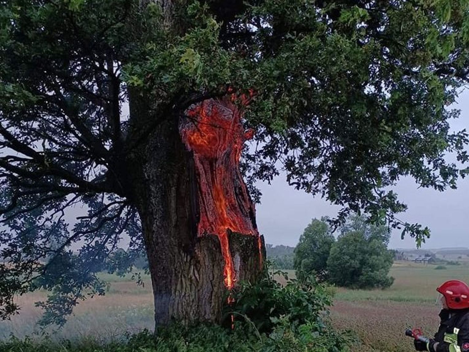 - Tego dnia dostaliśmy informację o pożarze drzewa, w które uderzył piorun. Po dotarciu na miejsce oraz rozpoznaniu sytuacji natychmiast przystąpiliśmy do ugaszenia za pomocą jednego prądu wody - informują druhowie na Facebooku.