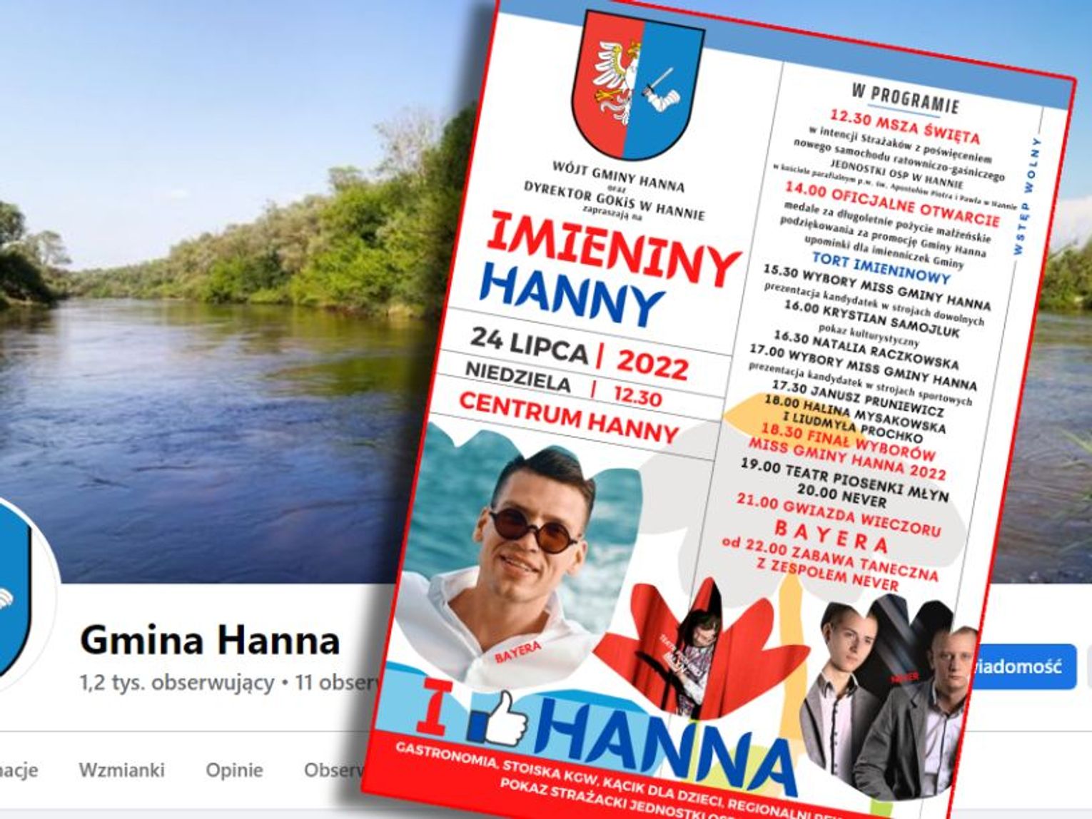 O godz. 16 będziemy mogli zobaczyć pokaz kulturystyczny w wykonaniu Krystiana Samojluka. Pół godziny po nim na scenie wystąpi Natalia Raczkowska, następnie zaśpiewa Janusz Pruniewicz, a potem usłyszymy duet Haliny Mysakowskiej i Liudmyły Prochko. Po wyborach Miss Gminy Hanna zaprezentuje się teatr piosenki Młyn i zespół Never. Gwiazdą wieczoru będzie zespół Bayer. Imieniny Hanny zakończy zabawa taneczna z zespołem Never.
