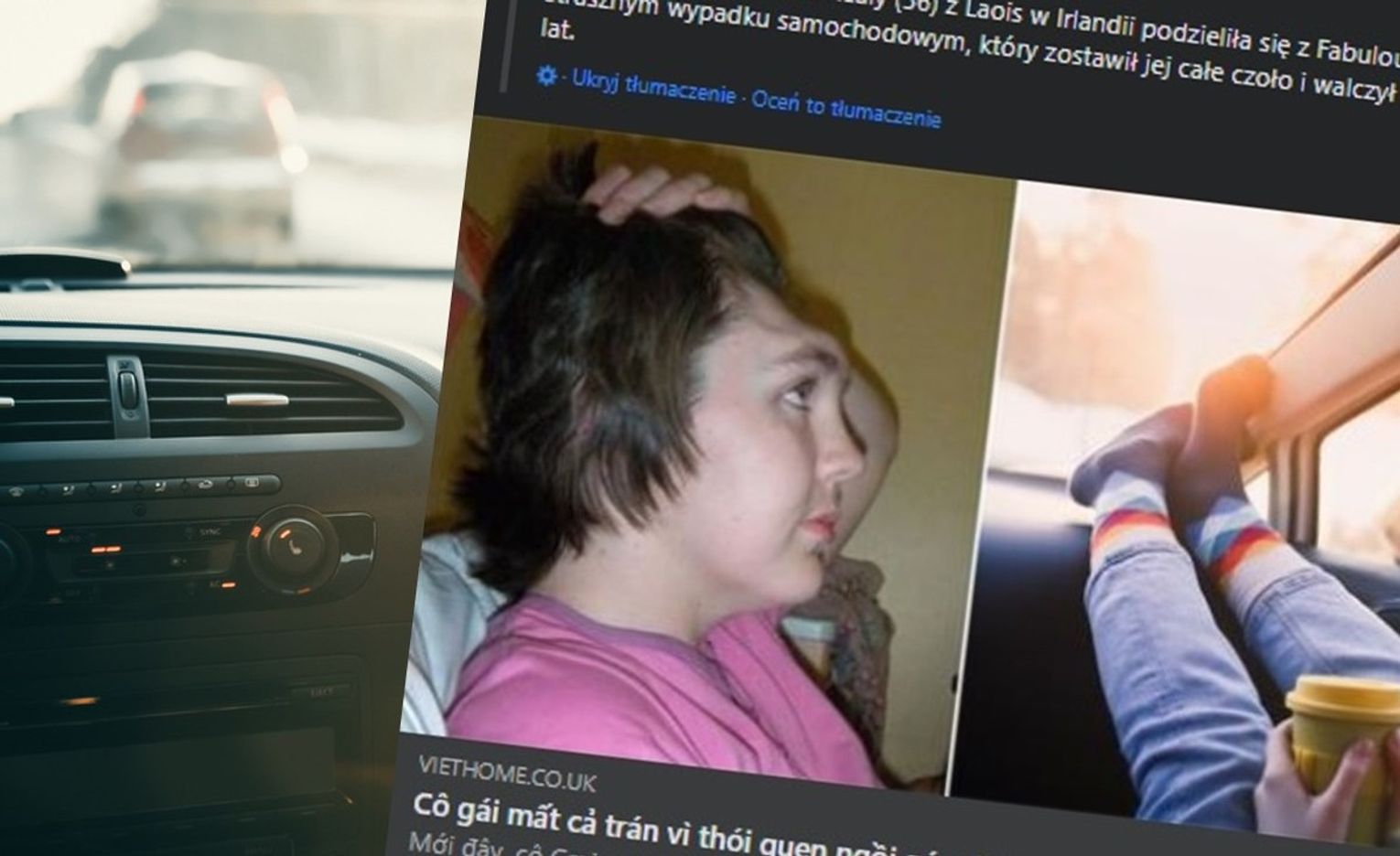 Samochód, którym poruszała się dziewczyna wpadł w poślizg i uderzył w ścianę, co uruchomiło poduszkę powietrzną. Jej wyrzut z prędkością 300km/h sprawił, że kolana wbiły się prosto w twarz. Następstwem tego uderzenia były uszkodzenia mózgu, utrata dwóch zębów i wiele innych obrażeń. Lekarze musieli wyciąć z jej czaszki połowę czoła, przez co stała się ikoną bezmyślnego opierania nóg o kokpit i przykładem, że tak robić nie należy.