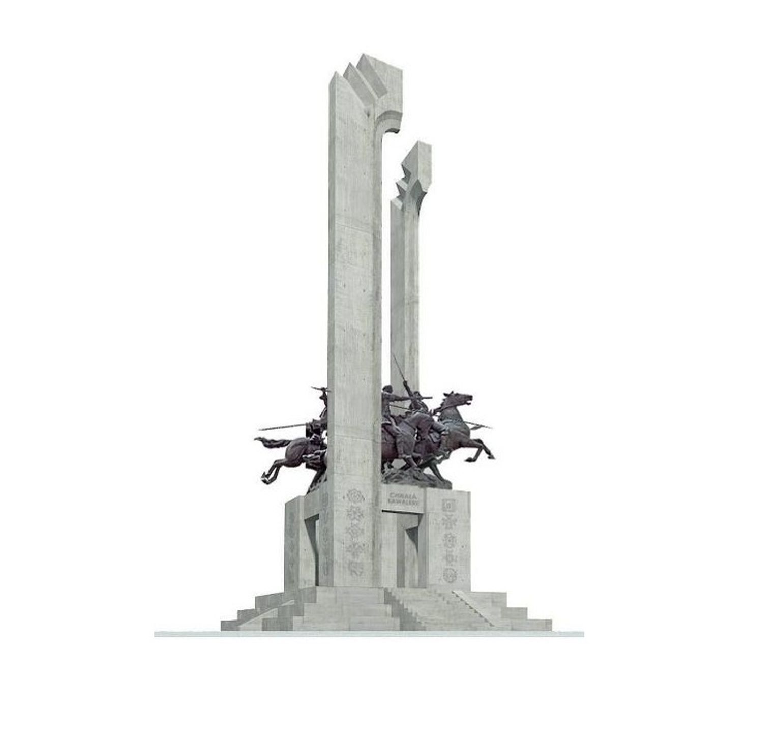 Pomnik to wielkie skrzydła husarskie, do których z czterech stron prowadzą schody. Na słupach znajdują się znaki 40 pułków kawalerii, a uwagę przykuwają potężne i jednocześnie lekkie odlane z brązu sylwetki trzech szarżujących kawalerzystów.
