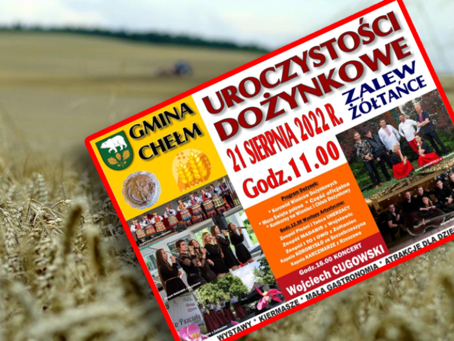 Punktualnie o godzinie 11 rozpocznie się tradycyjny korowód wieńców dożynkowych. Następnie mieszkańcy gminy oraz zaproszeni goście wezmą udział w polowej mszy św. Ok. 12.30 rozpocznie się program występów artystycznych, w trakcie którego wystąpią Zespół Pieśni i Tańca Uherzacy, Zespół Madabis w Wojsławic, Zespół To i Owo z Żółtaniec, Kapela Koromysło ze Szczebrzeszyna, Kapela Karczmarze z Rzeszowa.
