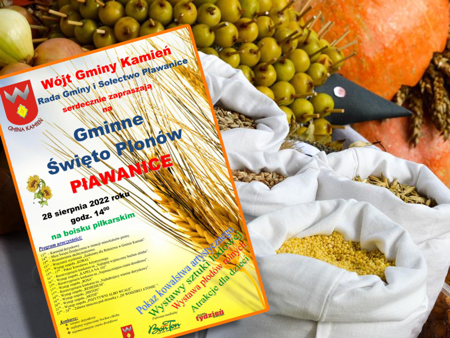 O tej godzinie należy pojawić się na pławanickim boisku, by być świadkiem przemarszu tradycyjnego dożynkowego korowodu. Następnie, o 14. zostanie odprawiona w intencji rolników i w podziękowaniu za tegoroczne plony uroczysta msza św. Tuż po nabożeństwie nastąpi część oficjalna, podczas której nastąpi wręczenie wyróżnień i tytułu "Zasłużony dla rolnictwa w gminie Kamień". Na dożynkowej scenie w Pławanicach pojawi się zespół Koral, Kapela na 102, Rosa, Remedium, Histon, Motif oraz Pozytywnie albo wcale. Wieczorną zabawę poprowadzi natomiast wodzirej DJ Atomic.