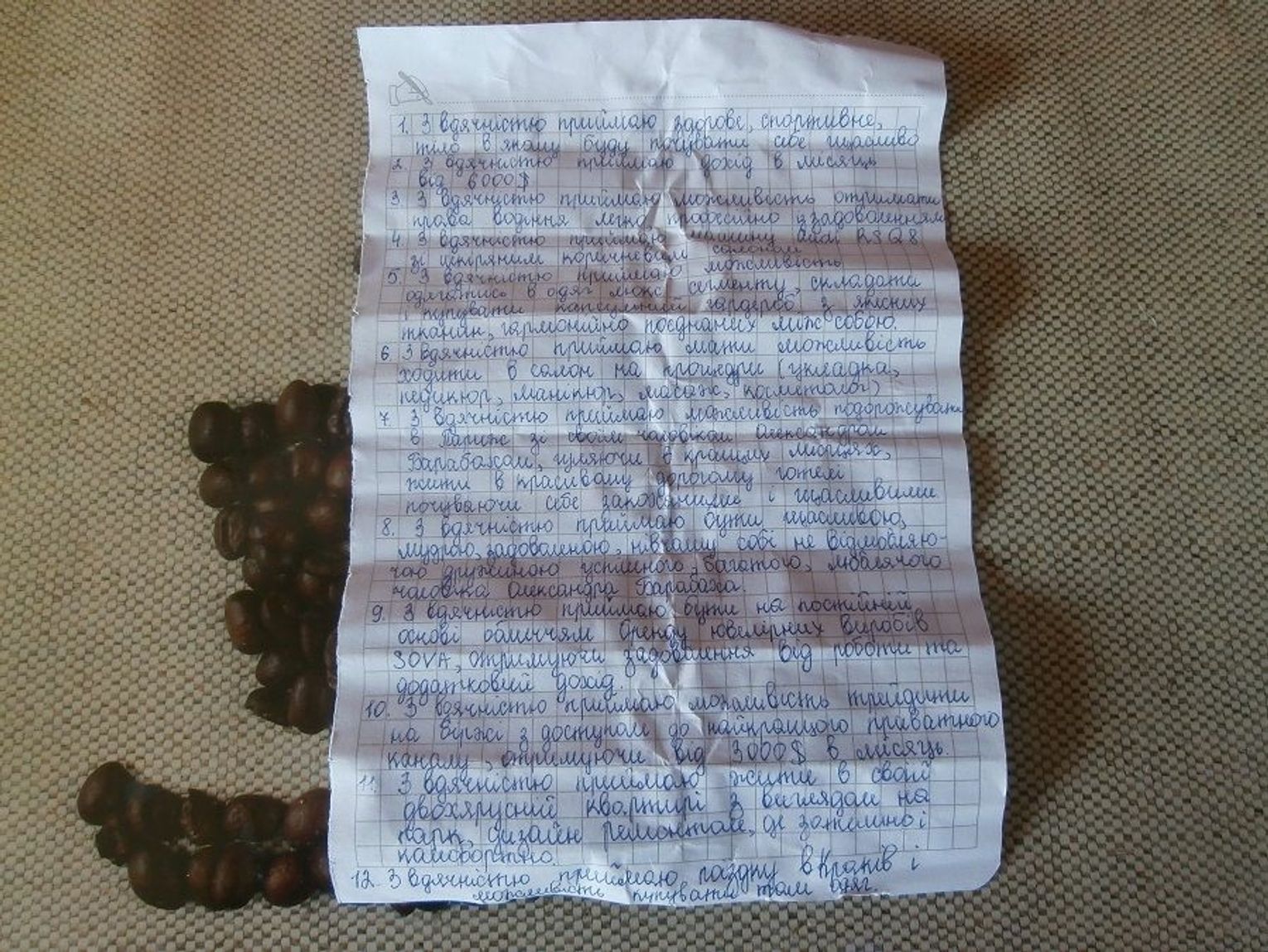 Co zatem udało się odczytać z kartki? W punkcie pierwszym pojawia się "podziękowanie" za zdrowie i sportową figurę, w drugim - za pensję z wysokości 6000 dolarów amerykańskich. Punkt trzeci budził wątpliwości, nie dało się go do końca odtworzyć. W punkcie czwartym mowa jest o Audi RS Q8 ze skórzanym wnętrzem. Punkt piąty to podziękowanie za luksusową garderobę i ubrania. W szóstym autor spisu dziękuje za możliwość chodzenia na masaże i liczne zabiegi pielęgnacyjne.