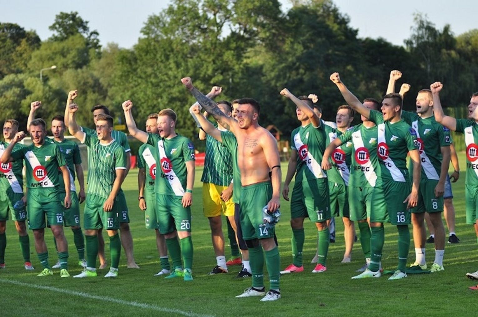 Biało-zieloni objęli prowadzenie w 28. minucie. Ładną akcję wyprowadził Przemysław Banaszak, zagrał do Dawida Niewęgłowskiego, a ten z pierwszej piłki uderzył na bramkę. Bramkarz Soły odbił futbolówkę, ale przy dobitce Aleksieja Pritulaka był już bez szans. 120 sekund później ukraiński zawodnik po raz kolejny wpisał się na listę strzelców. Tym razem Pritulak doszedł do odbitej od słupka piłki (po strzale Mateusza Kompanickiego) i z kilku metrów wpakował ją do siatki.