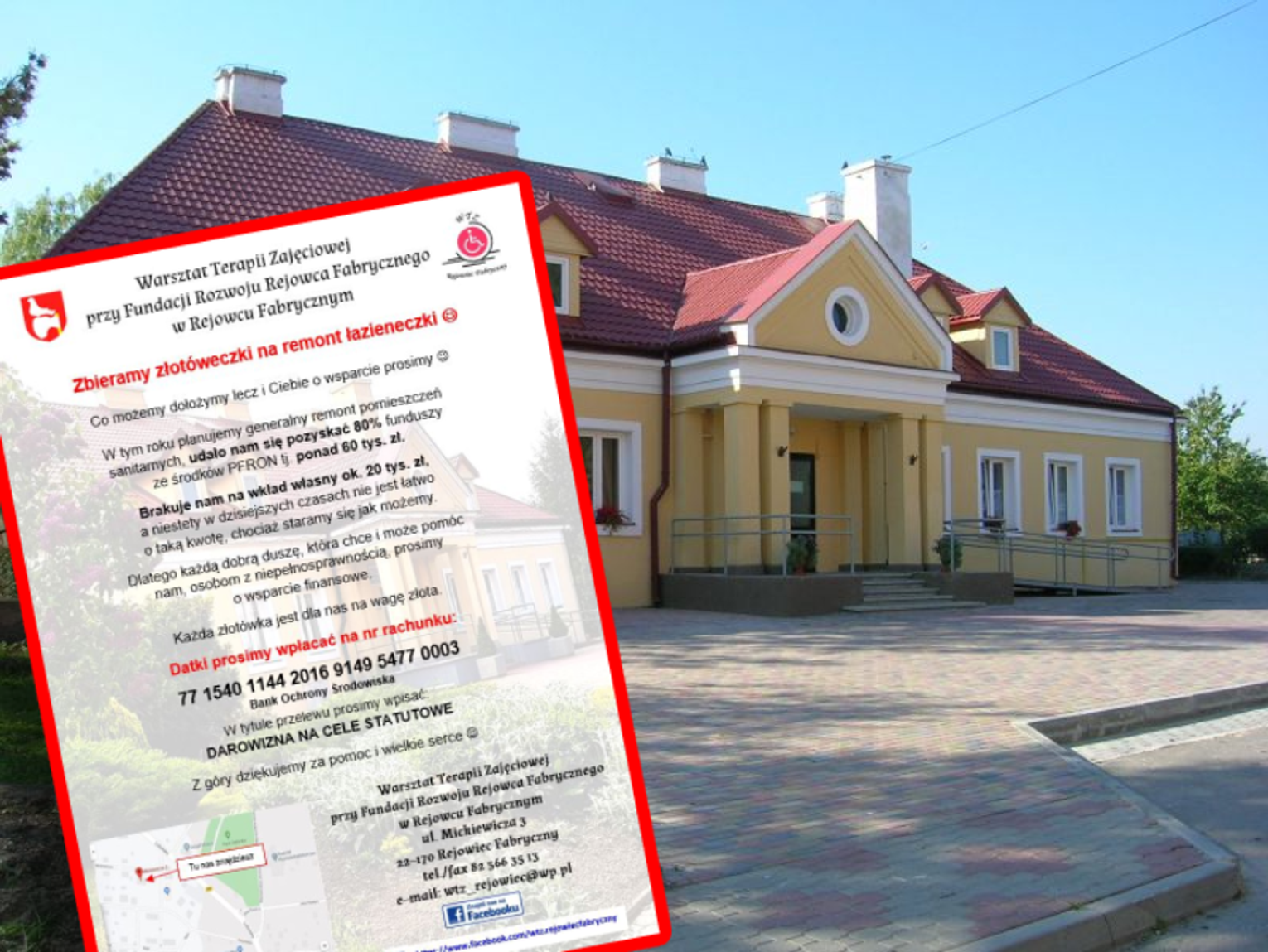 By jednak prace mogły postępować bez przeszkód i zostać doprowadzone do końca, pracownicy ośrodka potrzebują zebrać jeszcze blisko 14 tys. złotych. Fundację Rozwoju Rejowca Fabrycznego, organ prowadzący warsztaty, można wesprzeć dowolną kwotą "dotacji na cele statutowe", którą można wpłacić na następujący numer konta: 77 1540 1144 2016 9149 5477 0003.