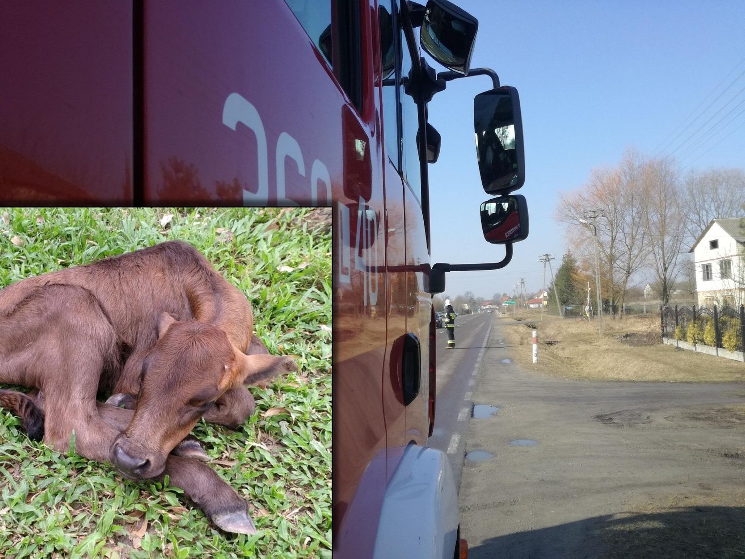 Kolizja ta zdarzyła się po godzinie 16 na drodze powiatowej. Cielak najwyraźniej miał ochotę dać dyla i nie zwracał uwagi na przejeżdżające auta. Kierowcy ciężarówki udało się wyhamować na tyle, by go nie poturbować, ale zwierzak wpadł pod samochód i się zakleszczył.