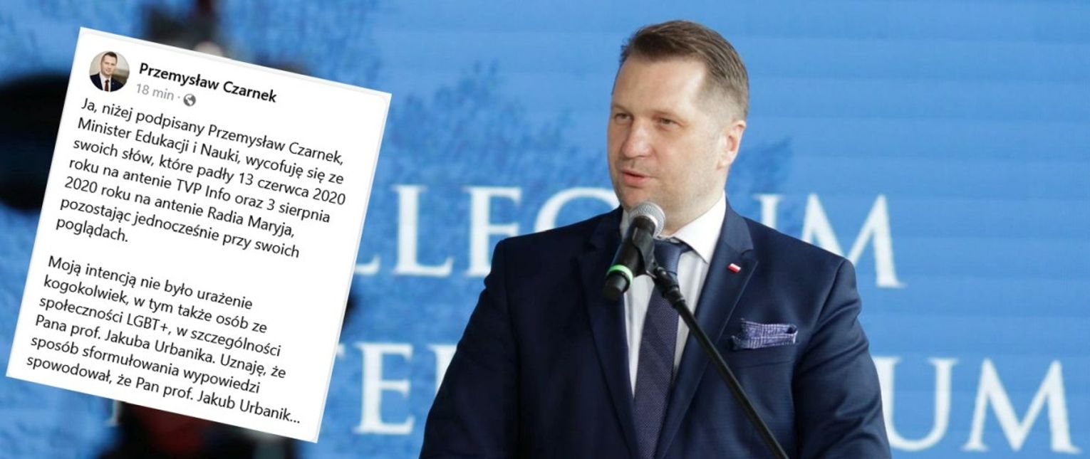 – Ja, niżej podpisany Przemysław Czarnek, Minister Edukacji i Nauki, wycofuję się ze swoich słów, które padły 13 czerwca 2020 roku na antenie TVP Info oraz 3 sierpnia 2020 roku na antenie Radia Maryja, pozostając jednocześnie przy swoich poglądach – napisał w dziś rano (28 września) w mediach społecznościowych Przemysław Czarnek.