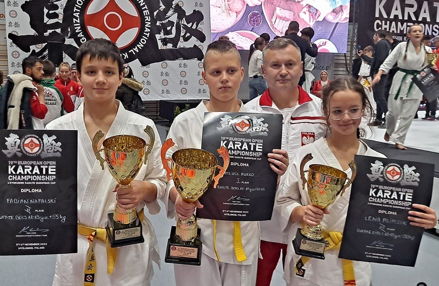 Złoty medal i tytuł mistrza Europy w kategorii kadetów 10-11 lat powyżej 50 kg zdobył Mateusz Hurko, który nie miał sobie równych. Wśród młodzików 12-13 lat w kategorii powyżej 55 kg srebro i tytuł wicemistrza zdobył Fabian Nafalski, który w finale, po bardzo wyrównanej walce z cięższym o 20 kg i dużo wyższym rywalem, przegrał przez wskazanie sędziów, które jednak nie było jednogłośne. Z kolei na trzecim miejscu uplasowała się Lena Pilipczuk, startująca w kategorii młodzików 12-13 lat do 50 kg. Pozostali zawodnicy Chełmskiej Szkoły Karate Kyokushin Satori, czyli Rozalia Bielak, Oliwia Urbańska, Oliwia Zalichta, Tycjan Bielak, Bartosz Pachuta, Dawid Wurszt i Wojciech Kłodnicki, stoczyli świetne pierwsze pojedynki, ale nie udało im się wejść do ścisłej europejskiej czołówki.