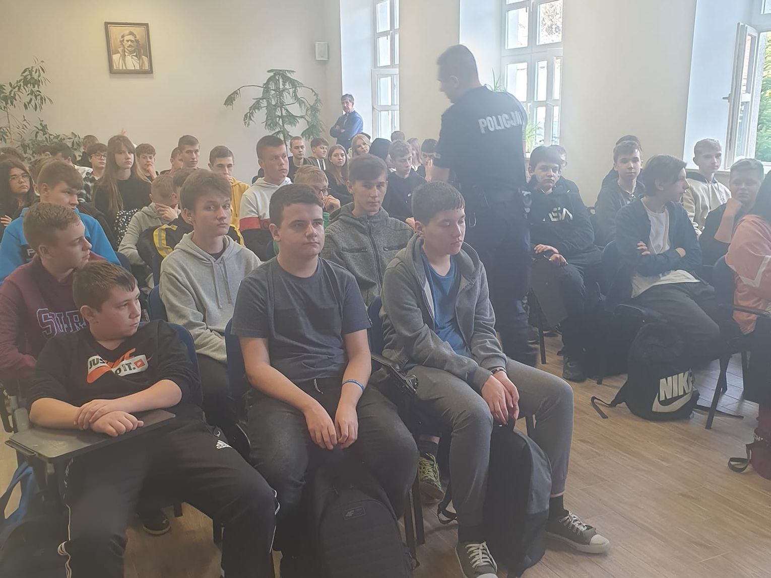 Młodszy aspirant Kamil Miszczak, który pełni też funkcję dzielnicowego na terenie, na którym znajduje się ZS nr 2, na spotkaniu z uczniami przekazał informację na temat odpowiedzialności karnej nieletnich. W swojej prelekcji policjant skupił się na najczęściej popełnianych wykroczeniach związanych m.in. z zastraszaniem, paleniem tytoniu i piciem alkoholu w miejscach publicznych, prowadzeniem pojazdów bez uprawnień i coraz częściej występującymi naruszeniami w zakresie cyberbezpieczeństwa. Dotyczyło to w szczególności zjawisk takich jak stalking czy udostępnianie danych osobowych, informacji i wizerunku w sieci.