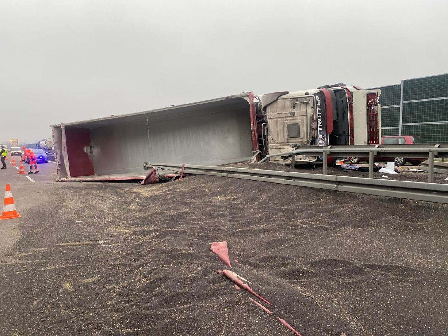 Do zdarzenia doszło 23 listopada. Kierowca ciągnika z naczepą stracił panowanie nad pojazdem, w efekcie TIR przewożący 20 ton rzepaku uderzył w barierę energochłonną i przewrócił się.