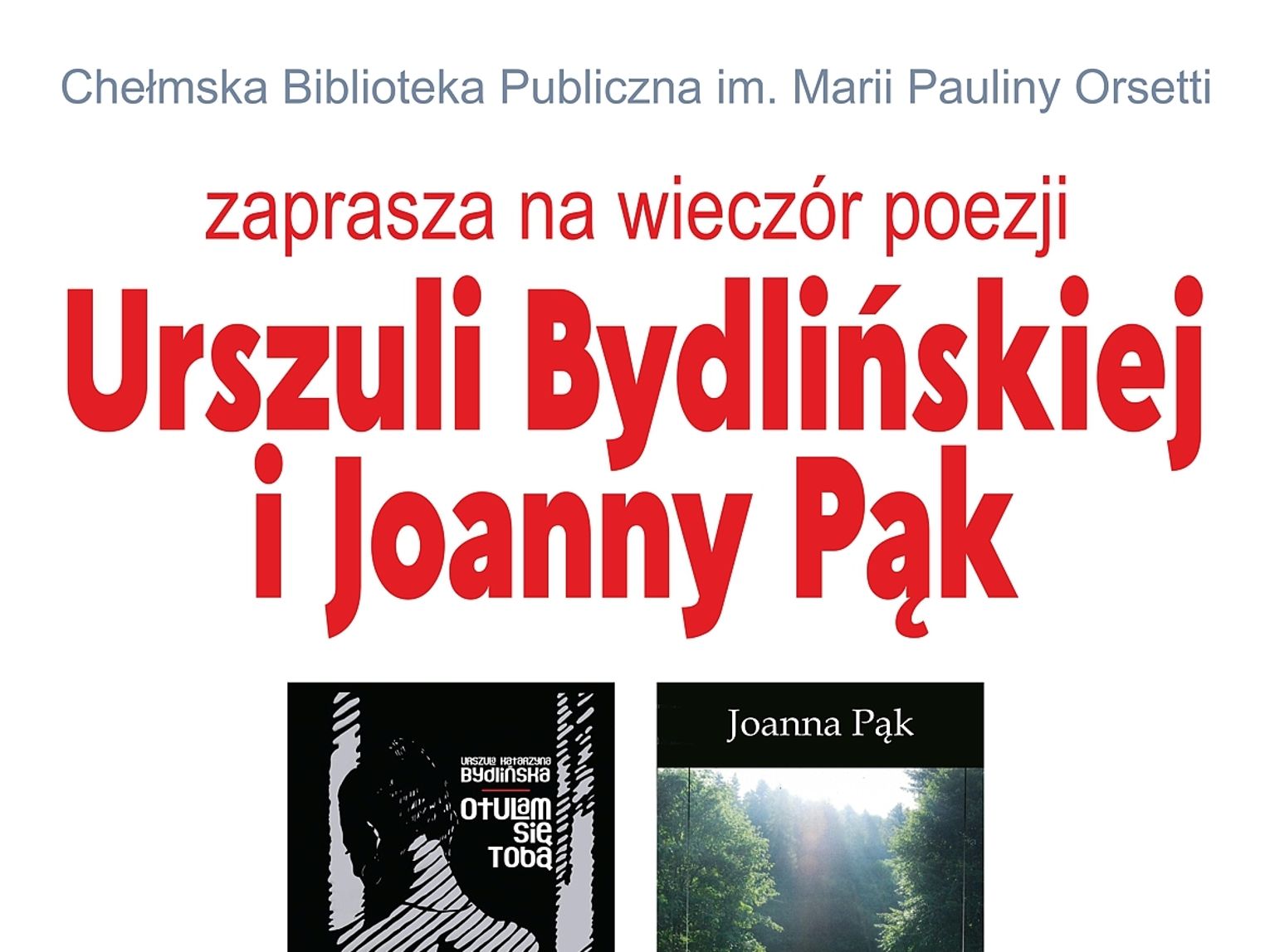 Poetki zaprezentują swoje tomiki poezji: Urszula Bydlińska - „Otulam się Tobą”, zaś Joanna Pąk - „Światłocienie”. Ich wiersze recytować będą: Małgorzata Kołodyńska, Iwona Buczek i Dorota Gołębiowska. Spotkanie uatrakcyjni występ wokalny Bogusława Kędziory oraz minikoncert chełmskiego barda Jarosława Buczka.