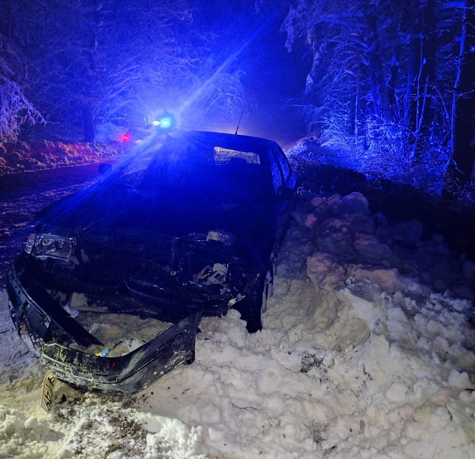 100 m dalej na przejeżdżający po drodze powiatowej samochód marki Skoda, pod naporem śniegu, upadło drzewo, które najprawdopodobniej już wcześniej stwarzało zagrożenie.