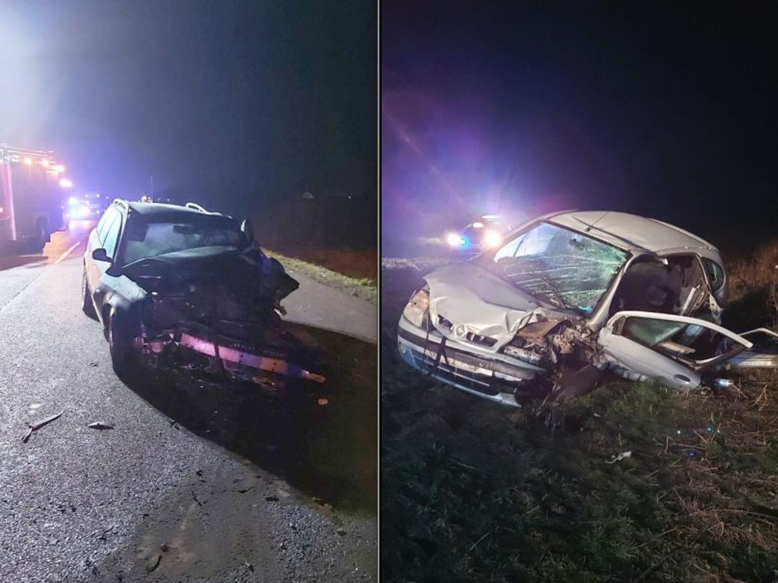 Kierujący z audi i renault zostali ranni i zabrani do szpitali. Droga jest całkowicie zablokowana.