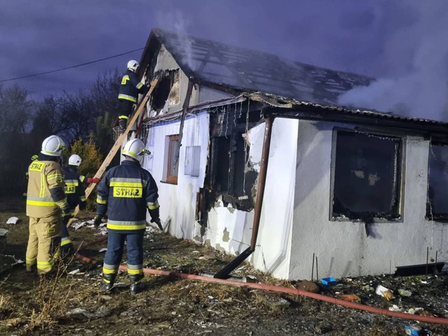 Palił się dach drewnianego budynku mieszkalnego krytego eternitem. Kobieta nie wymagała hospitalizacji. Strażacy wynieśli z domu niestety martwego już psa.