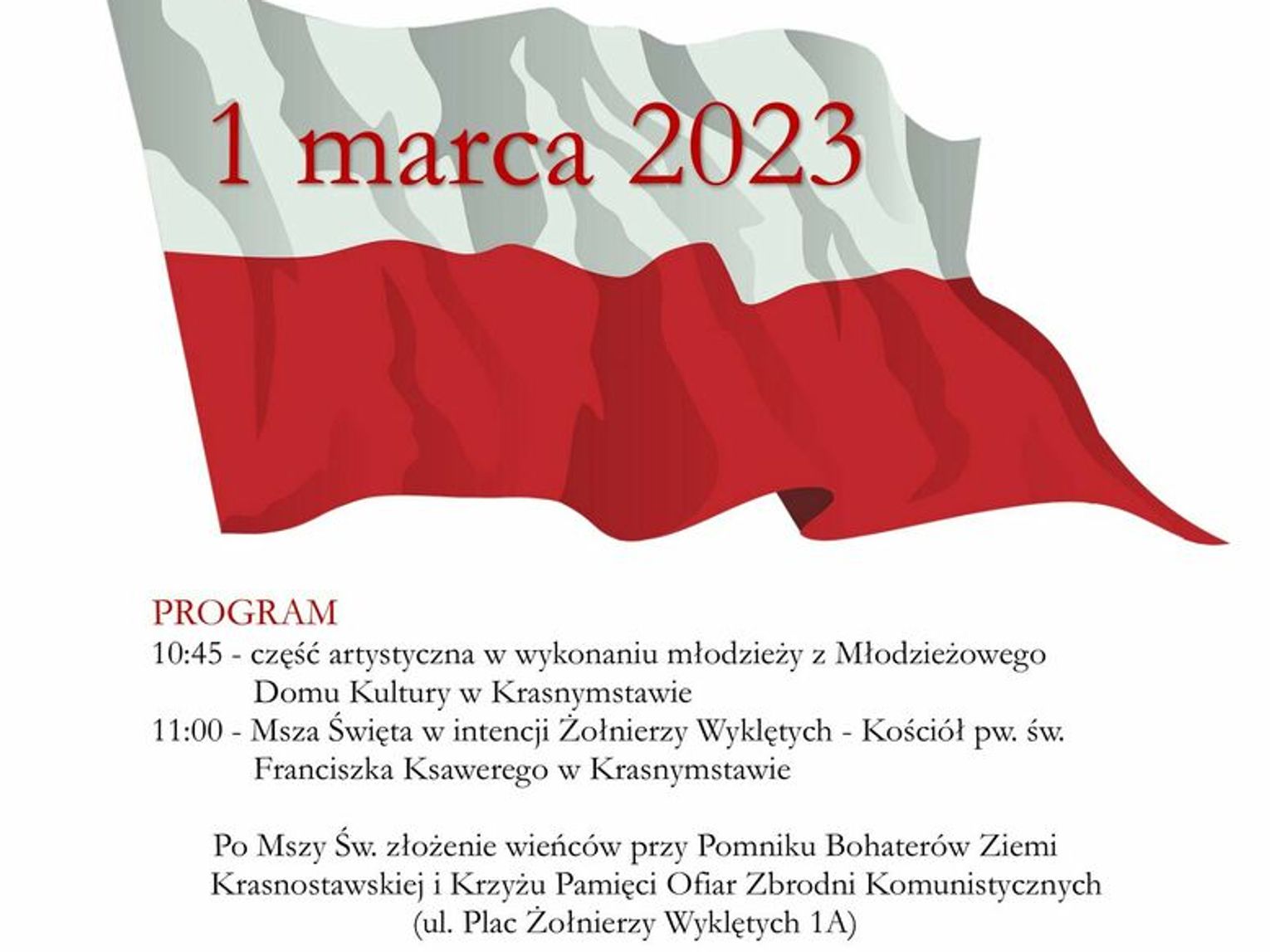Po liturgii nastąpi złożenie wieńców przy Pomniku Bohaterów Ziemi Krasnostawskiej w rynku miejskim. Następnie delegacje przejdą na Plac Żołnierzy Wyklętych, gdzie złożą kwiaty pod Krzyżem Pamięci Ofiar Zbrodni Komunistycznych.