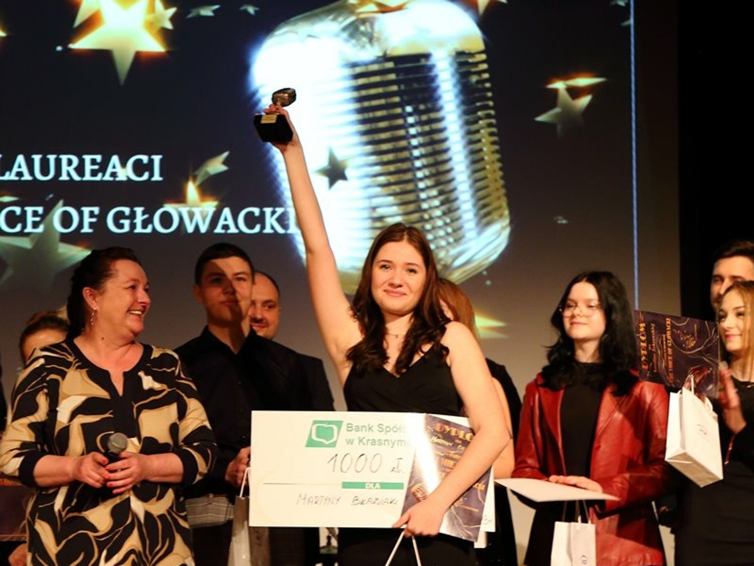 - Laureatką pierwszego miejsca została Martyna Błaziak. Wywalczyła nagrodę pieniężną w wysokości 1000 zł ufundowaną przez Bank Spółdzielczy w Krasnymstawie, nagranie piosenki w profesjonalnym studiu nagraniowym Damiana Chabrosa „Twins Studio”, bon na zakupy do wykorzystania w sklepach jubilerskich Aurum o wartości 100 zł, miesięczny karnet na siłownię od klubu Xtreme Fitness Krasnystaw, a także pamiątkową statuetkę – złoty mikrofon - informuje Anna Kurzak, nauczycielka ZS nr 2 w Krasnymstawie i jedna ze współorganizatorek konkursu.