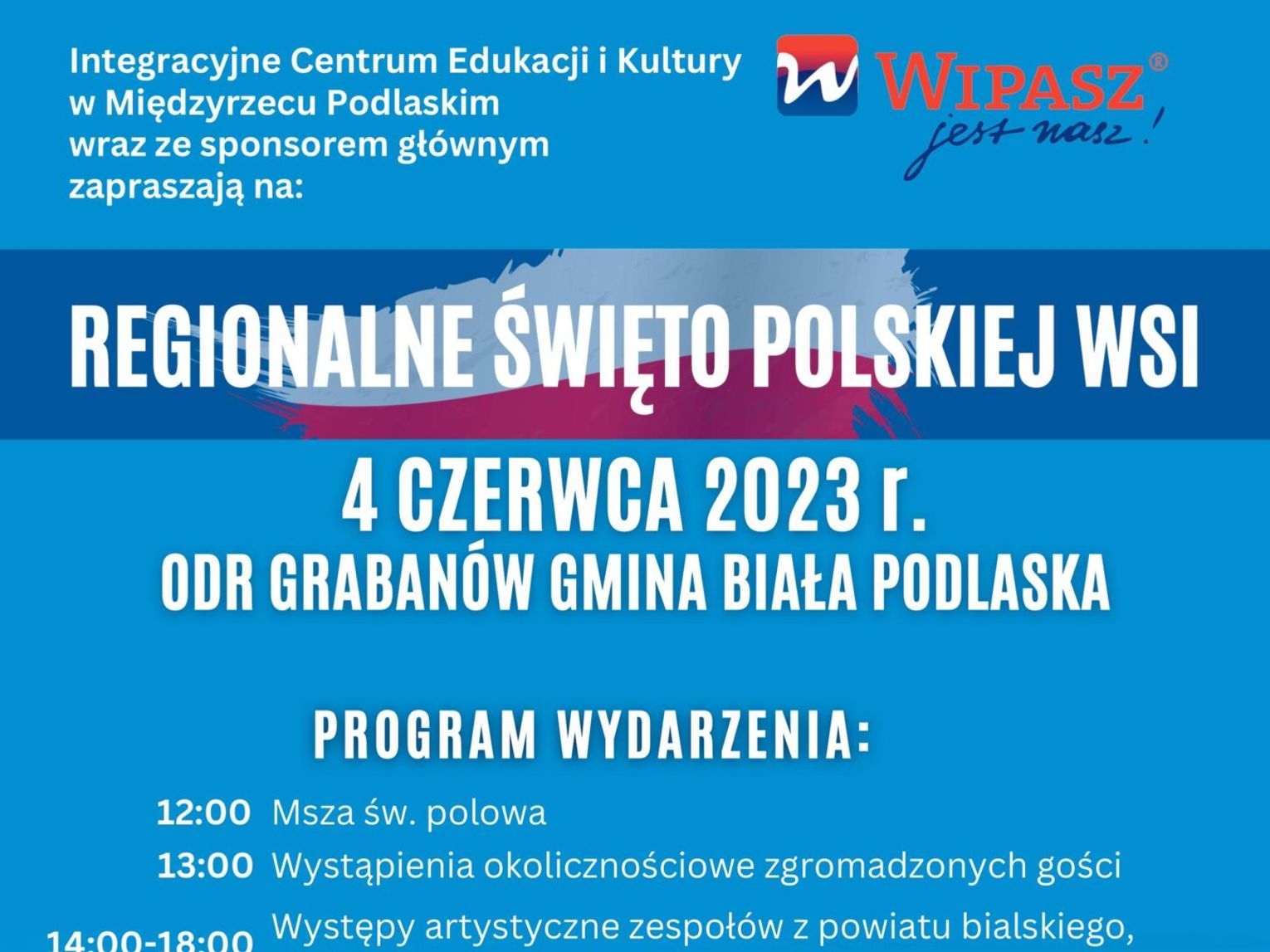 Centrum Edukacji i Kultury w Międzyrzecu Podlaskim zaprasza w niedzielę, 4 czerwca. Wydarzenie rozpocznie o 12 msza święta polową, następnie godzinę później przewidziano wystąpienia okolicznościowe zgromadzonych gości. Po południu usłyszmy występy artystyczne zespołów z powiatu bialskiego, chełmskiego, parczewskiego i włodawskiego.