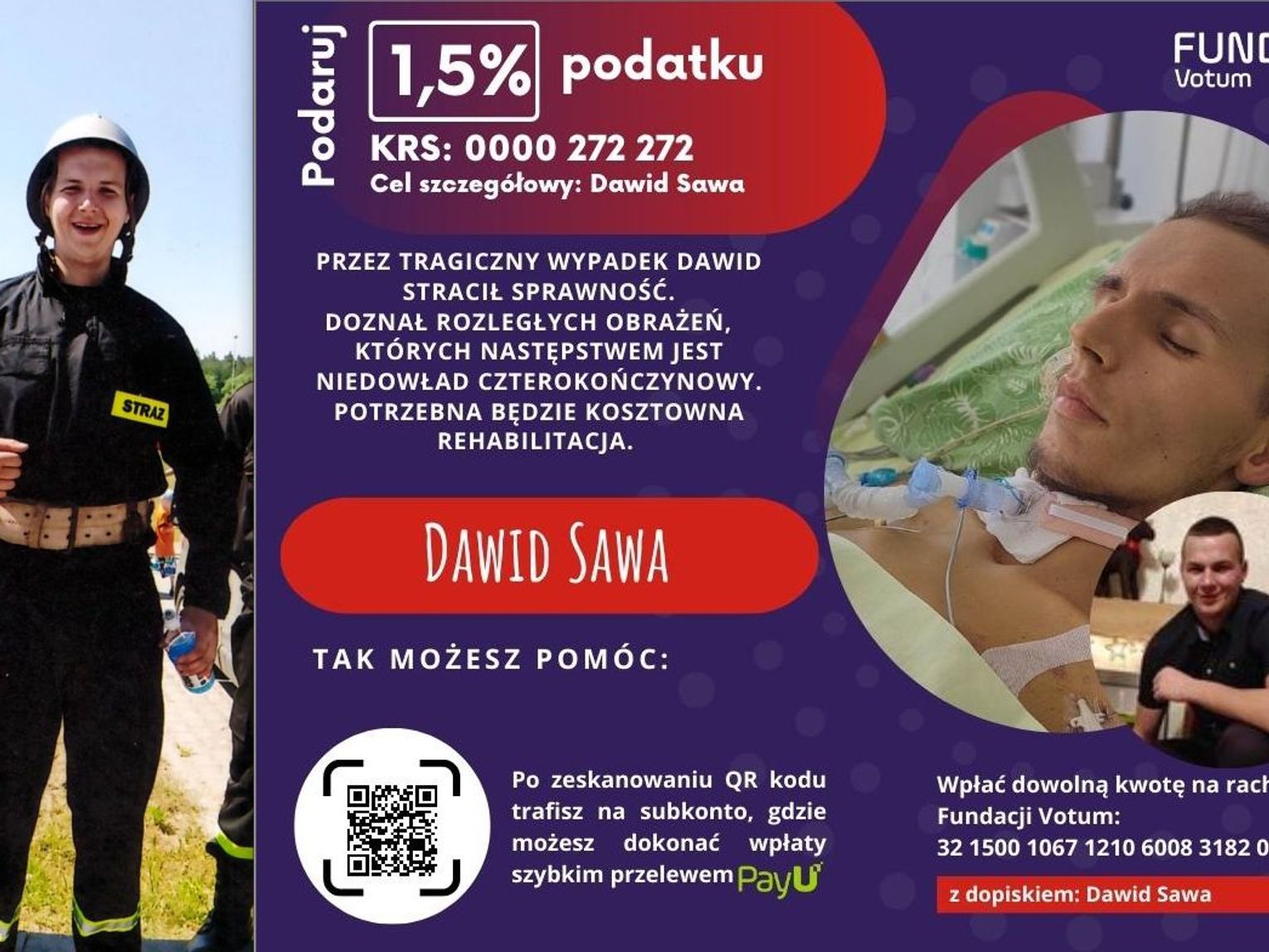 Dowolną kwotę można wpłacić na rachunek Fundacji Votum: 32 1500 1067 1210 6008 3182 0000 z dopiskiem: Dawid Sawa. Po zeskanowaniu kodu QR na zdjęciu głównym użytkownicy smartfonów zostaną przekierowani na specjalne subkonto w celu wykonania szybkiego przelewu PayU.