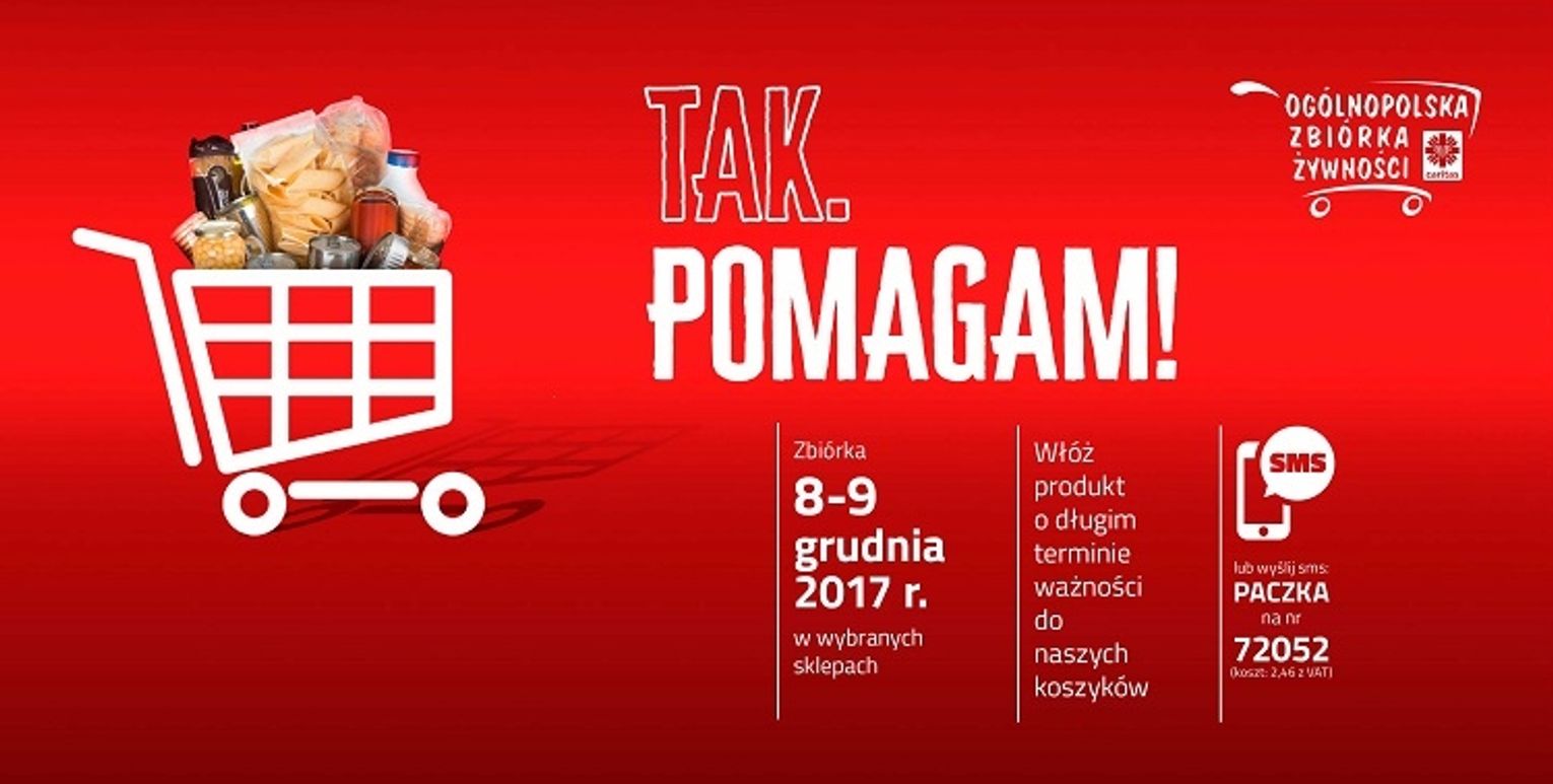 W dniach 8 i 9 grudnia 2017 r. odbędzie się ogólnopolska XIII Zbiórka Żywności Caritas pod hasłem „Tak-Pomagam“. Podobnie jak w latach ubiegłych zbierane będą artykuły spożywcze z długim terminem ważności takie jak mąka, ryż, cukier, makaron, płatki kukurydziane, olej, konserwy, herbata, słodycze itp. Z zebranych produktów przygotowane zostaną paczki, które trafią do najuboższych, chorych i bezdomnych mieszkańców naszego województwa.