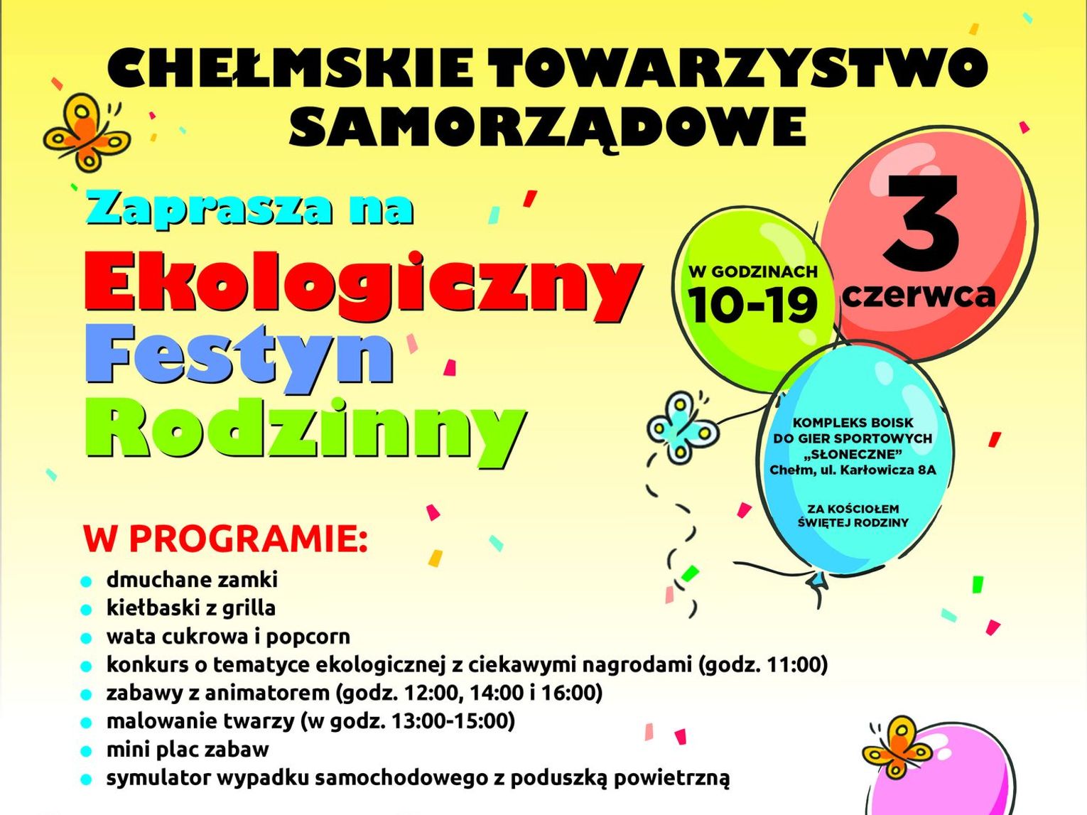 W programie znalazły się również zabawy z animatorem, malowanie twarzy, mini plac zabaw, kiełbaski z grilla, wata cukrowa oraz popcorn, a także zabawa na dmuchańcach i symulator wypadku samochodowego z poduszką powietrzną, którą zapewni Wojewódzki Ośrodek Ruchu Drogowego w Chełmie.