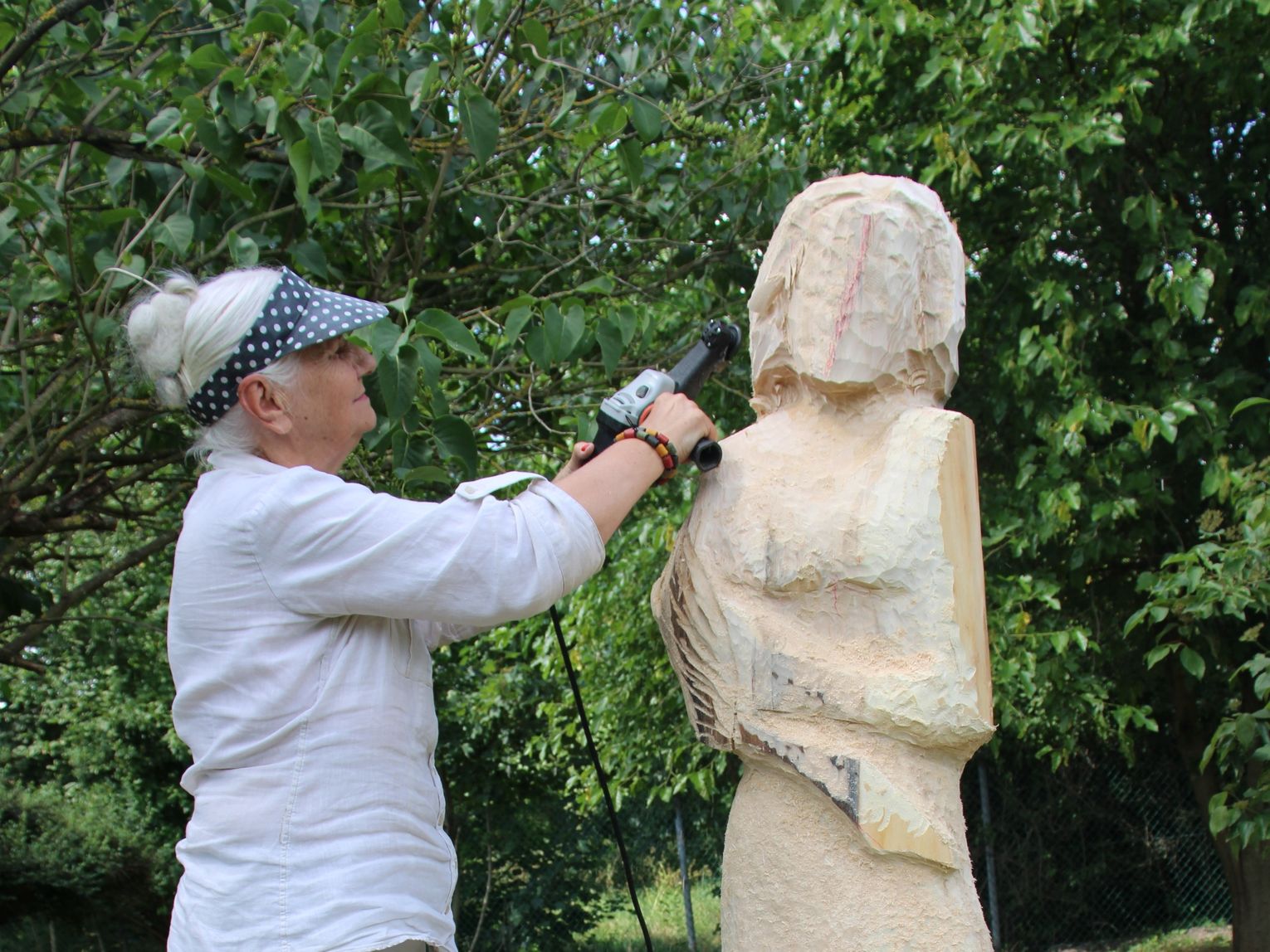- Pomysł na rzeźbę pojawia się w momencie, kiedy chodzimy wokół projektu, analizujemy go i zastanawiamy się. Czasami patrzymy na drzewo i rodzi się koncept. Następnie wykonujemy szkice. Później stajemy przed klocem drewna i chcemy wydobyć z niego, to co cenne – opowiada pani Władysława. - Teraz rzeźbi się za pomocą pił łańcuchowych i spalinowych. Frezarka także bardzo ułatwia pracę. Tak powstają tematy. Często nie wiemy, co będzie przedmiotem rozważań, jako artyści, musimy po to sięgnąć głębiej.