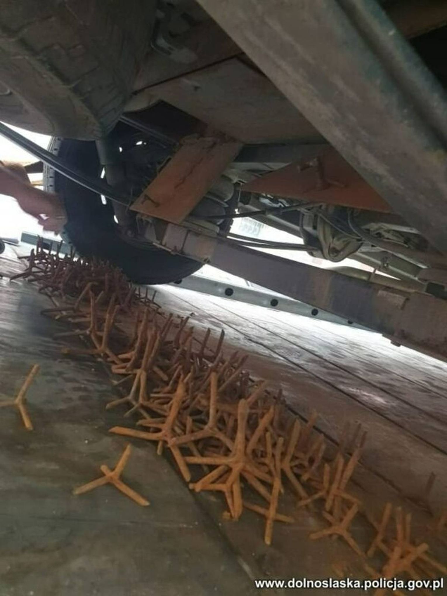 Kiedy policjanci zaczęli się przyglądać dostawczakowi odkryli, że pod podwoziem znajdują się trzy skrzynki z kolcami.