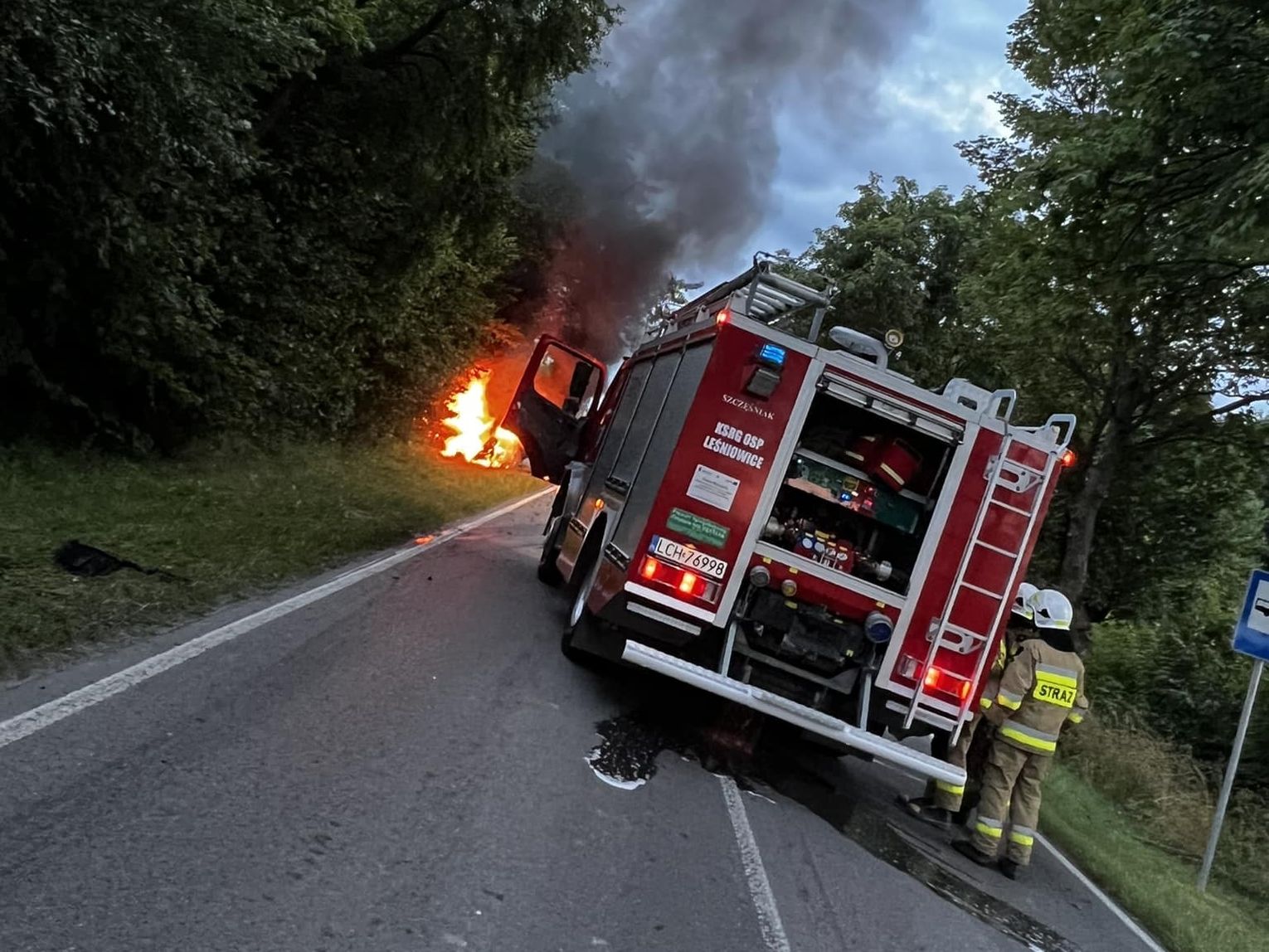 Do niebezpiecznego zdarzenia doszło w sobotę, 29 lipca. Przed godz. 20 strażacy z Chełma otrzymali informację o kolizji i pożarze samochodu. Na miejsce przyjechali również druhowie z Leśniowic.
