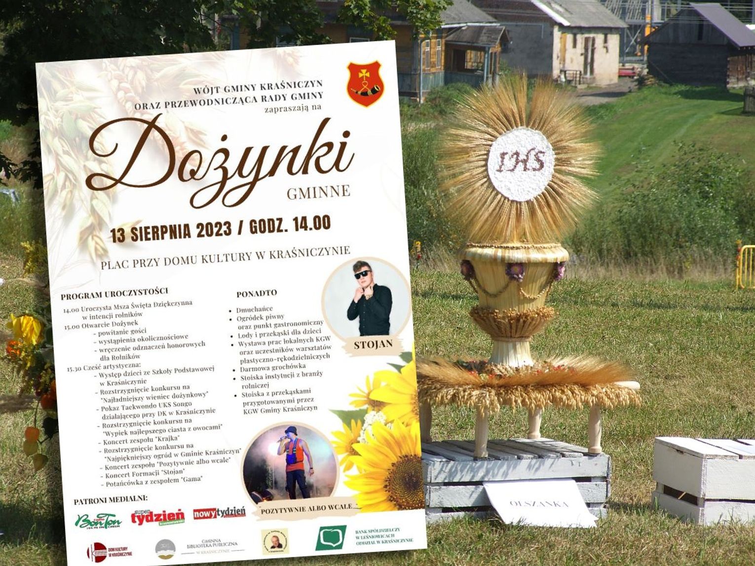 Część artystyczna przewidziana jest od godz. 15.30 do późnego wieczora. Na scenie wystąpią dzieci ze Szkoły Podstawowej w Kraśniczynie, zespół „Krajka”, zespół „Pozytywnie albo wcale”, Formacja „Stojan”, a wszystko zakończy potańcówka z zespołem „Gama”.