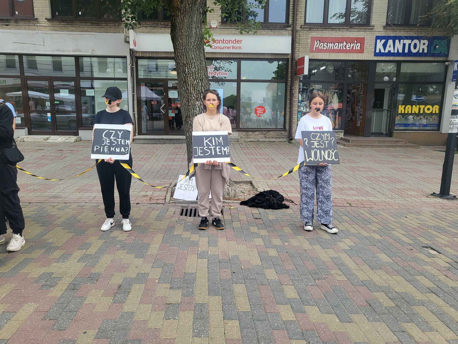 Od kilku dni na chełmskim deptaku można zastać niecodzienny widok. Stoją tam młodzi ludzie, mają ręce związane taśmą i zaklejone usta. Trzymają tablice, na których widnieją hasła: "Czy jestem piękna?", "Czym jest wolność?", "Kim jestem?".