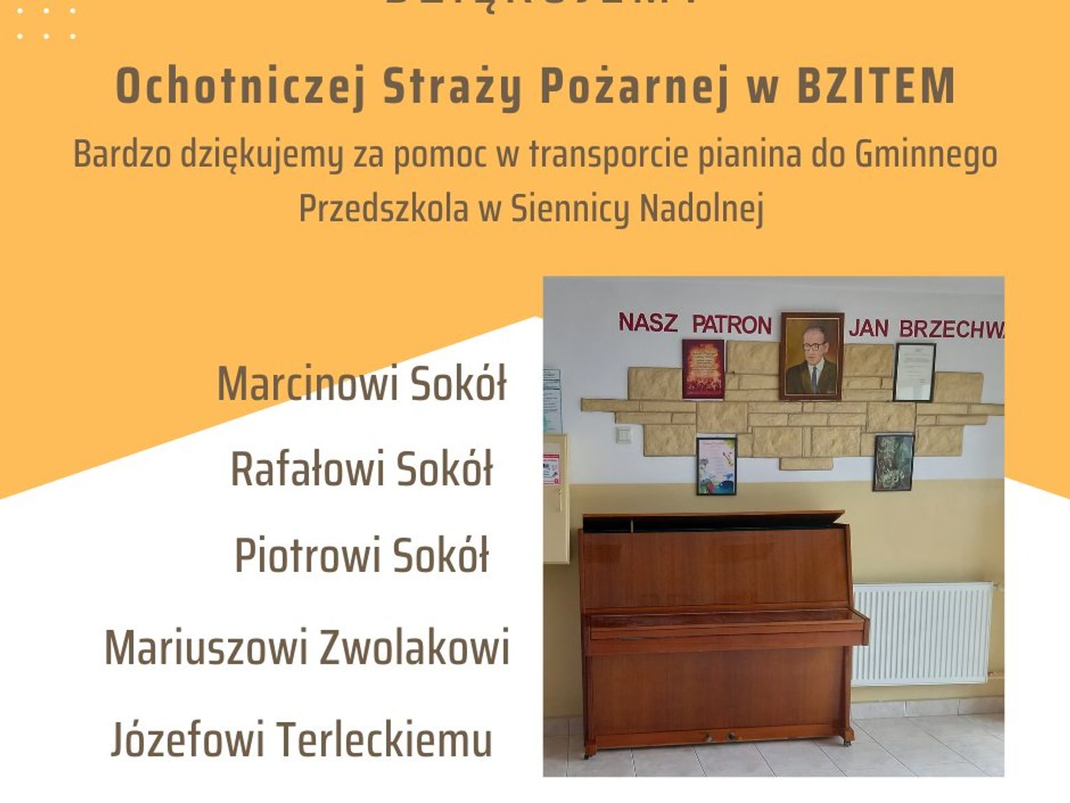 - Gdy dowiedziałam się, że nasza pani psycholog Justyna Godula chce sprzedać to pianino, to była sytuacja nie do odrzucenia. Nawet miała kupca, ale uznała, że skoro ma sprzedać je za małe pieniądze, to woli je przekazać maluchom, za co jej serdecznie dziękujemy. Gdyby nie pomoc strażaków z Bzitego, którzy z trzeciego piętra znieśli ważący pewnie 200 kilogramów instrument, pewnie musielibyśmy z tego zrezygnować. Wśród tych druhów byli nasi dawni wychowankowie - mówi Joanna Ćwikła, szefowa przedszkola w Siennicy Nadolnej.