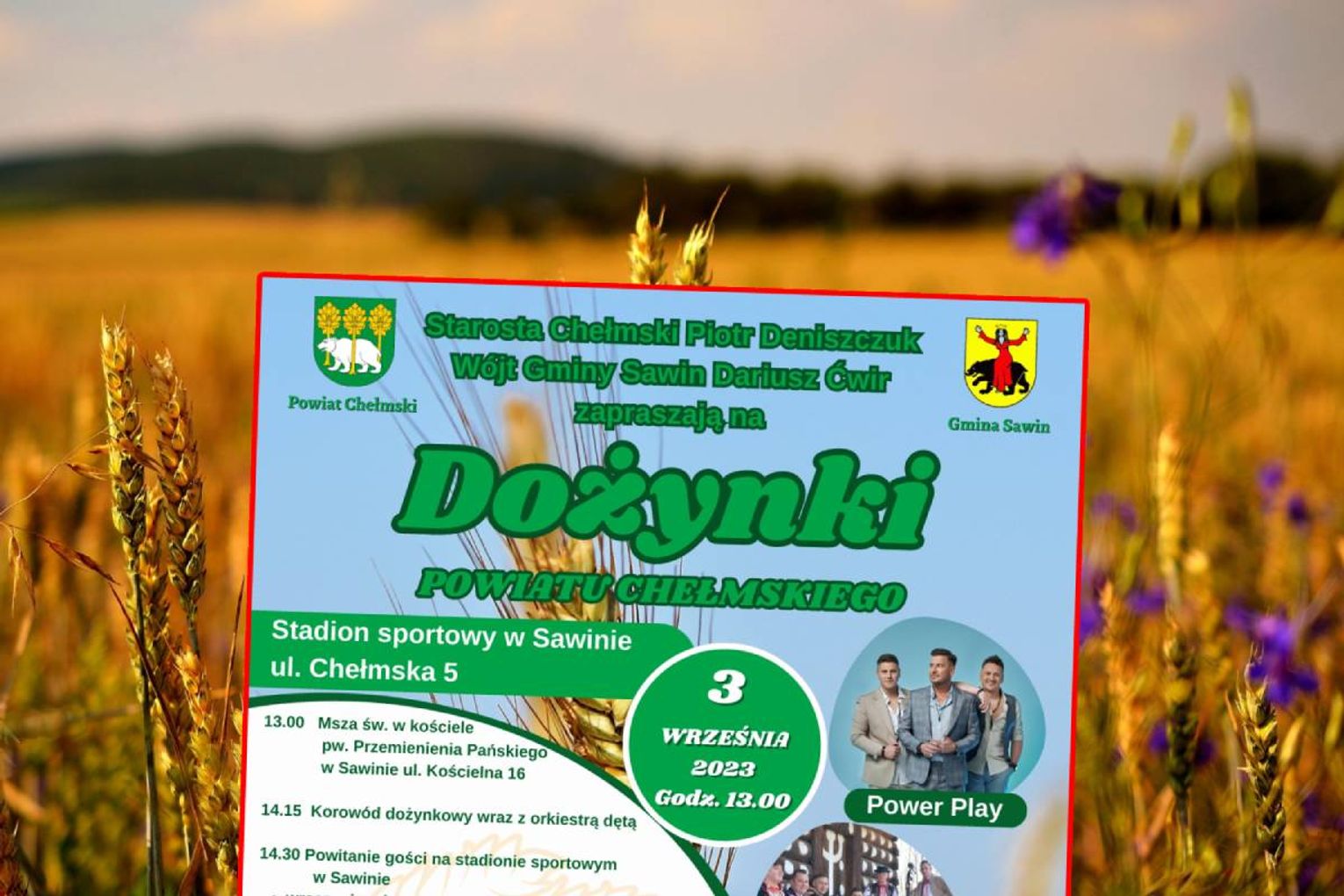 Później sceną zawładną kapele ludowe z terenu powiatu chełmskiego oraz zaproszeni goście. Odbędzie się również gala laureatów I Powiatowego Festiwalu Piosenki Biesiadnej. Ok. 20 na scenie pojawi się „Góralska Kapela Cacani”, a tuż po niej gwiazda wieczoru, czyli Power Play. Ten, kto przyjedzie do Sawina, z pewnością nie poczuje się zawiedziony. Organizatorzy zadbali o wszystko, co potrzebne do dobrej zabawy.