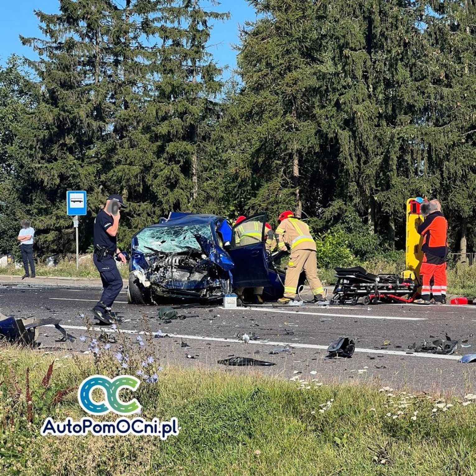 Na miejscu pracują służby: straż pożarna, pogotowie ratunkowe oraz policja.