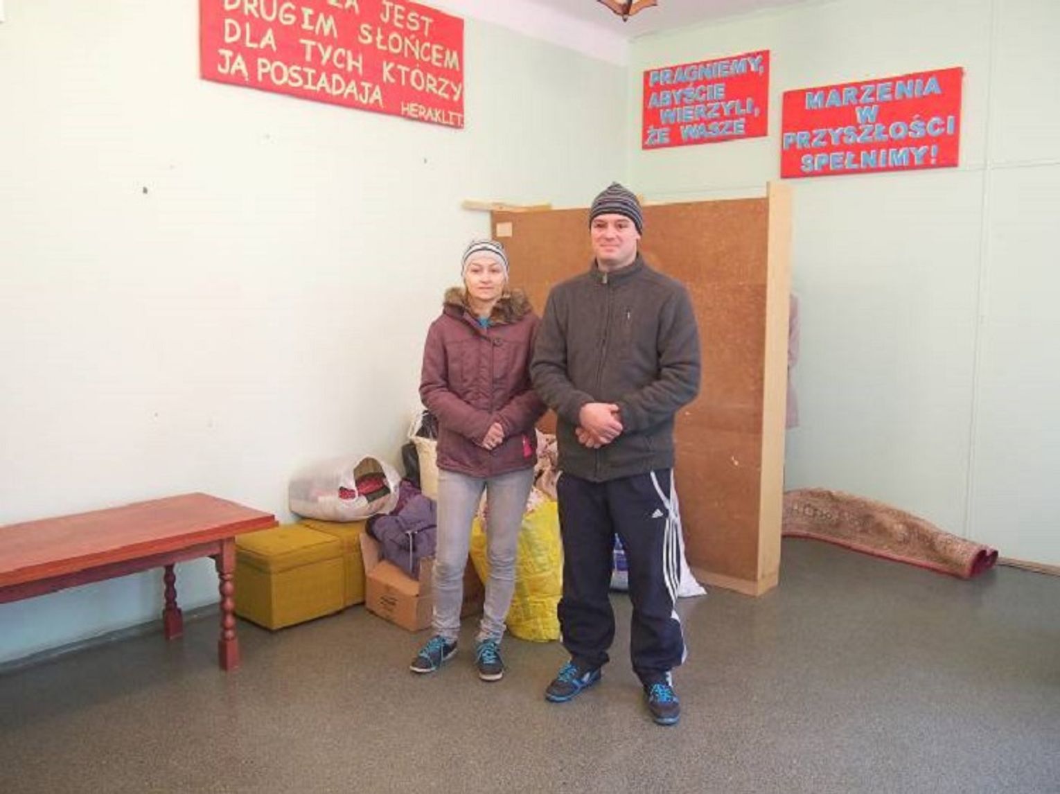 Składzik jest nadal niemal pusty. Ktoś przywiózł biurko, ławę, stary telewizor i trochę ubrań, kołder i naczyń.