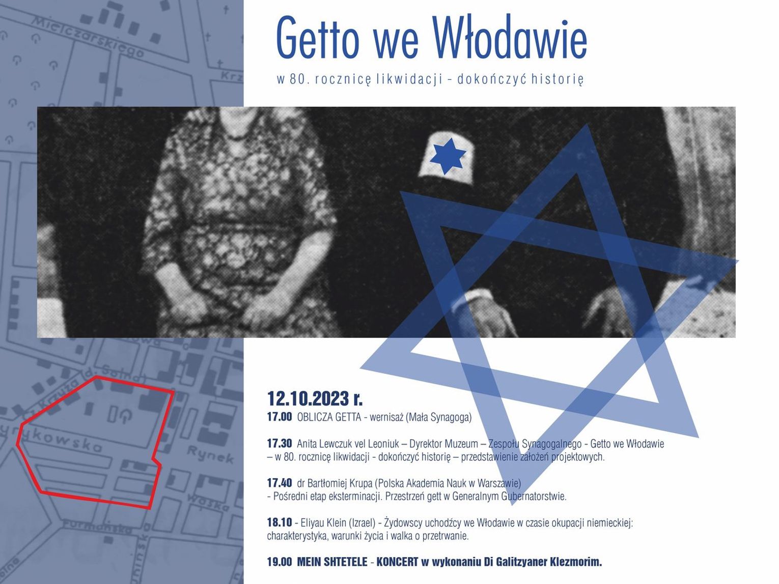 Wydarzenie rozpocznie się w czwartek (12 października) o godzinie 17. wernisażem Oblicze Getta (mała synagoga). Następnie odbędzie się przedstawienie założeń projektowych, które poprowadzi Anita lewczuk vel Leoniuk, dyrektor Muzeum Zespołu Synagogalnego we Włodawie. Później głos zabierze dr Bartłomiej Krupa z Polskiej Akademii Nauk w Warszawie, który przybliży wszystkim pośredni etap eksterminacji. Po nim wystąpi Eliyau Klein z Izraela, który opowie o Żydowskich uchodźcach we Włodawie w czasie okupacji niemieckiej oraz o charakterystyce, warunkach życia i walce o przetrwanie. A na koniec będzie występ w Di Galitzyaner Klezmorim “Mein Shtetele”.