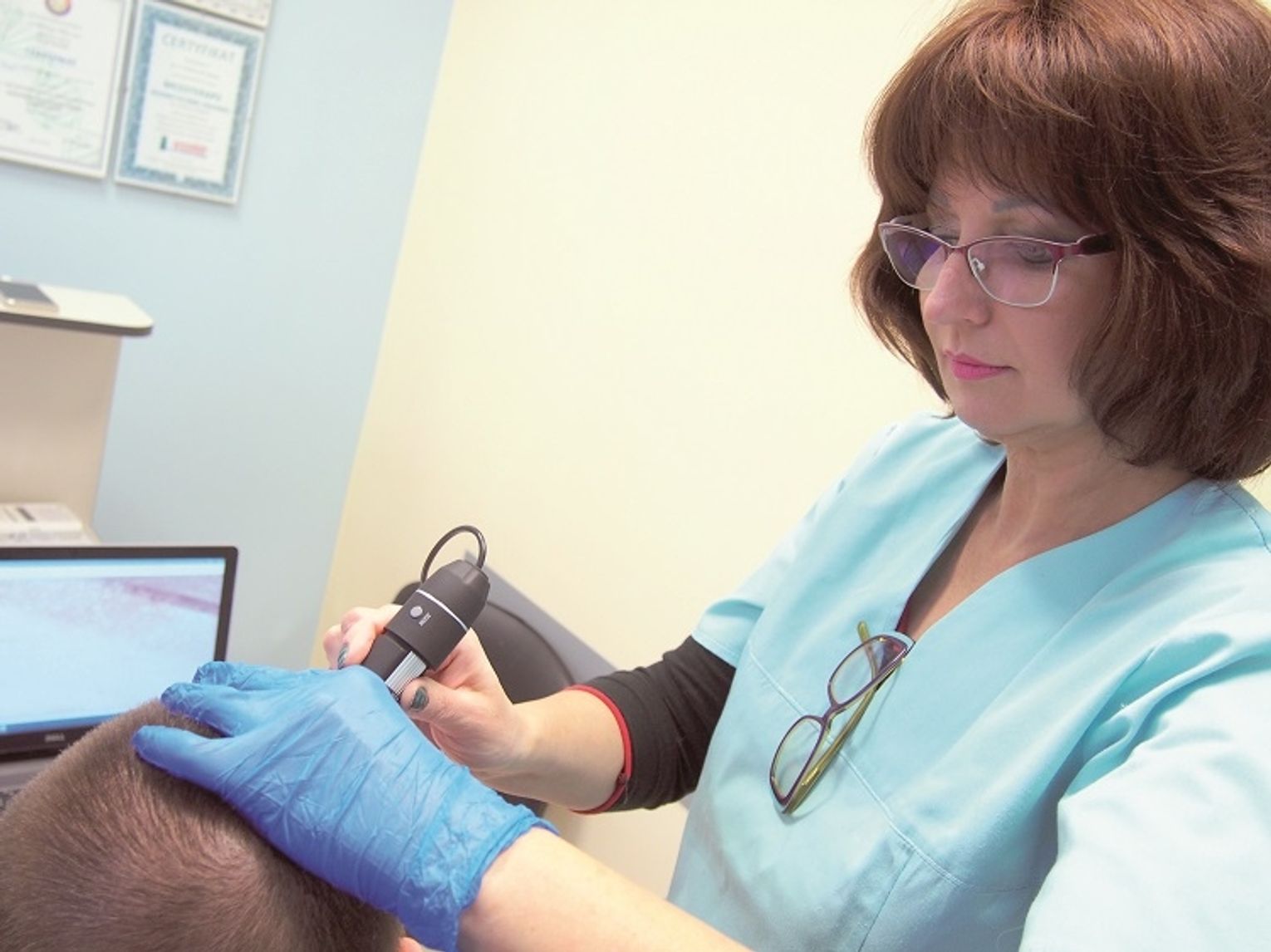 - Przeprowadzamy badania skóry głowy, mieszków włosowych, cebulek oraz faz fizjologicznych wzrostu włosa - mówi Joanna Fedorczuk. - Można u nas wykonać badania trychoskopu i trychogramu, niezbędne do zdiagnozowania problemu. Jeśli zachodzi potrzeba, zlecamy wykonanie badania krwi.