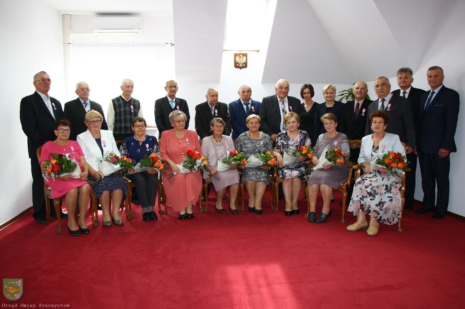 Medale za "długoletnie pożycie małżeńskie", gratulacje i życzenia kolejnych jubileuszy w zdrowiu i radości przekazali małżonkom wójt gminy Krasnystaw Edyta Gajowiak-Powroźnik, przewodniczący rady gminy Krzysztof Golec, starosta krasnostawski Andrzej Leńczuk i kierownik Urzędu Stanu Cywilnego Renata Gałan.