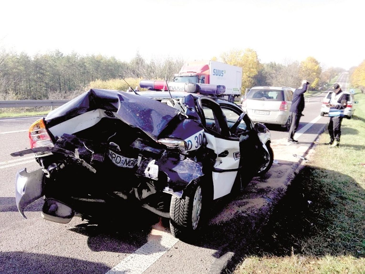 Siła uderzenia była tak duża, że policyjne auto obróciło na drodze. Znalazło się potem na przeciwległym pasie ruchu, a na koniec otarło jeszcze o opla zafirę, jadącego w kierunku Lublina. Aby wydostać funkcjonariuszy z samochodu, strażacy musieli użyć specjalistycznego sprzętu.