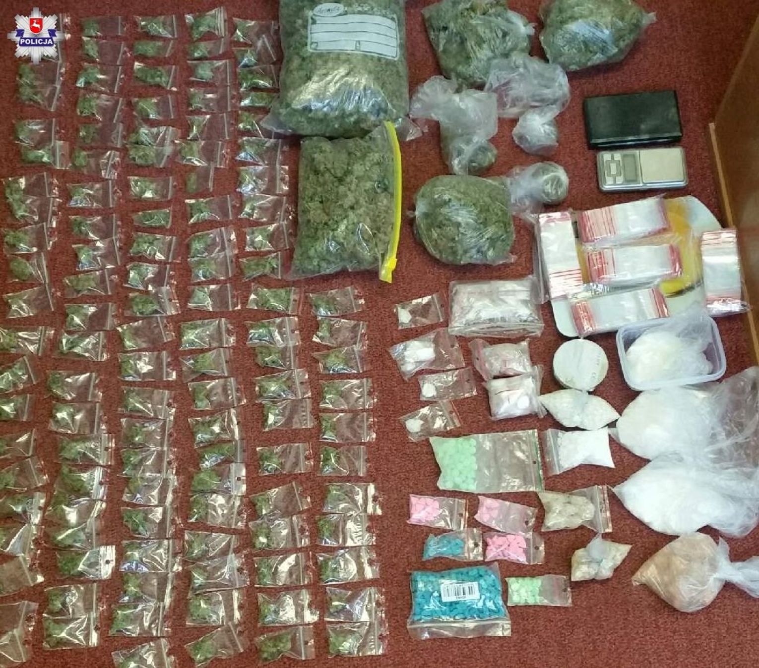 Chełmscy kryminalni zapukali do drzwi jednego z mieszkań w Chełmie. Lokal wynajmował 20–letni mężczyzna oraz jego 38–letnia znajoma. W trakcie przeszukania mieszkania oraz ich samochodu policjanci znaleźli znaczną ilość narkotyków. Ponad 700 gramów marihuany, blisko 130 gramów amfetaminy i blisko 400 gramów mefedronu. Stróże prawa zabezpieczyli też prawie 300 tabletek ekstazy oraz trzy wagi służące do porcjowania narkotyków.