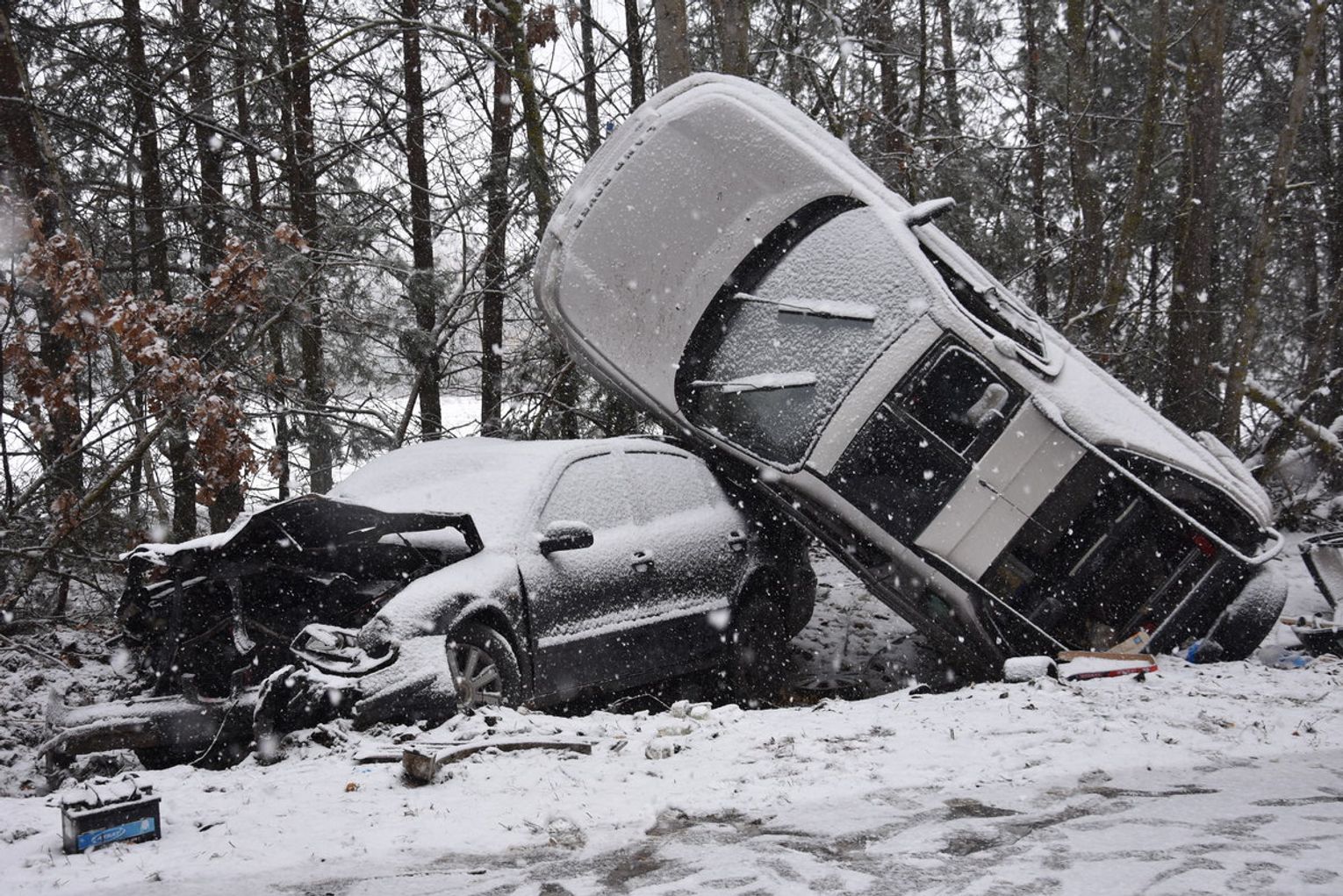 Po kilku minutach jadący tą samą drogą land roverem 67-latek, prawdopodobnie wpadł w poślizg i po zjechaniu z jezdni uderzył w drzewo i „dachował”, upadając na stojącego w rowie seata. Pokrzywdzony kierujący oraz jego 67-letnia żona doznali obrażeń ciała i zostali przewiezieni do szpitala. Niestety, mimo udzielanej pomocy medycznej życia 67-leteniego kierującego nie dało się uratować.